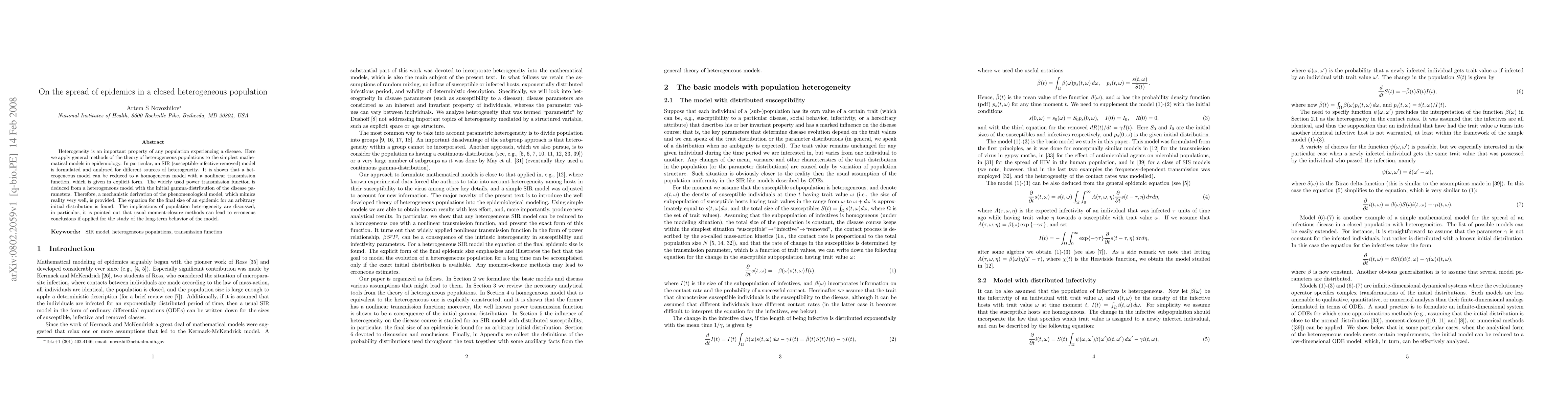 Heterogeneity is an important property of any population experiencing a disease. Here we apply general methods of the theory of heterogeneous populations to the simplest mathematical models in epidemiology. In particular, an SIR (susceptible-infective-removed) model is formulated and analyzed for different sources of heterogeneity. It is shown that a heterogeneous model can be reduced to a homogeneous model with a nonlinear transmission function, which is given in explicit form. The widely used power transmission function is deduced from a heterogeneous model with the initial gamma-distribution of the disease parameters. Therefore, a mechanistic derivation of the phenomenological model, which mimics reality very well, is provided. The equation for the final size of an epidemic for an arbitrary initial distribution is found. The implications of population heterogeneity are discussed, in particular, it is pointed out that usual moment-closure methods can lead to erroneous conclusions if applied for the study of the long-term behavior of the model.