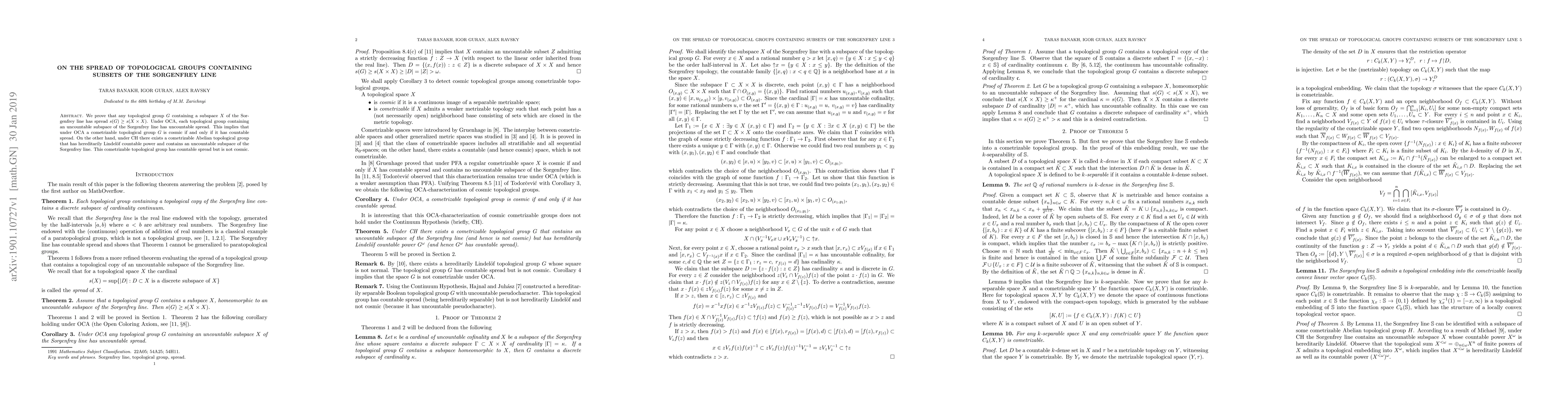 Research shows that certain topological groups containing subsets of the Sorgenfrey line have minimum spread sizes related to the spread of those subsets.