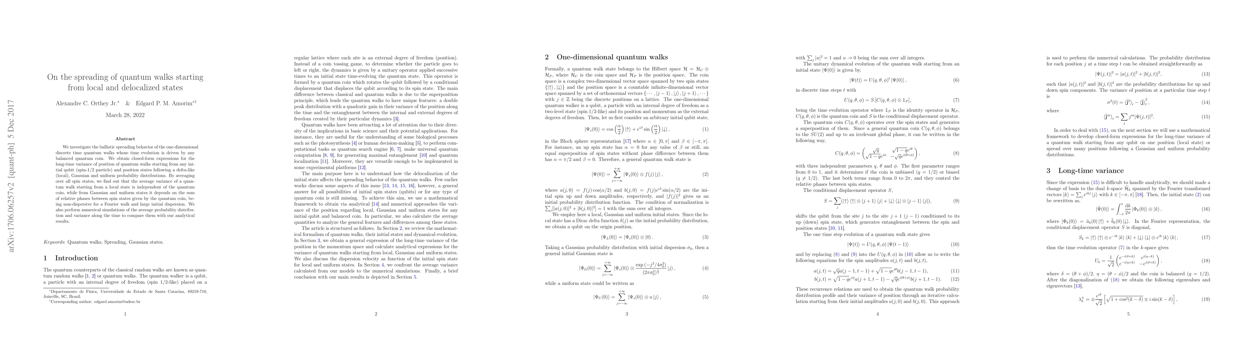 Researchers study the spreading behavior of quantum walks starting from different initial states, finding that variance depends on the coin used for time evolution and the type of initial distribution.