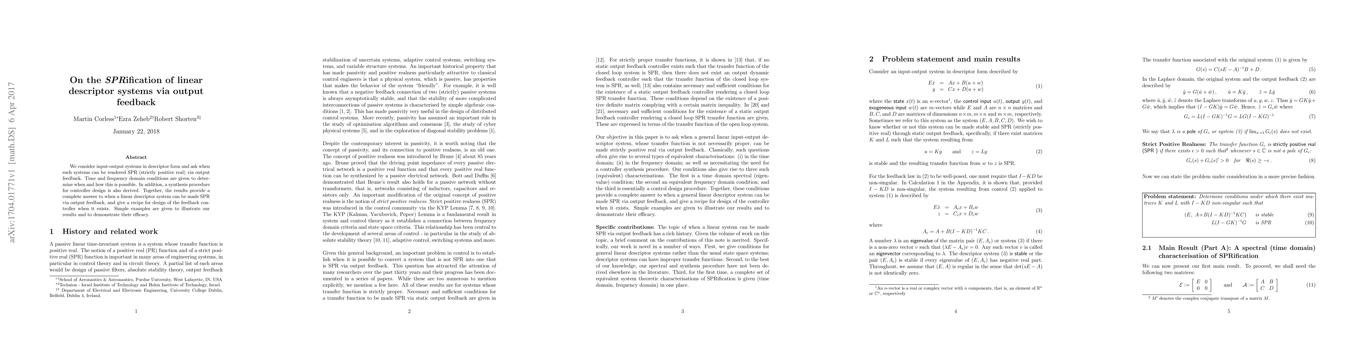 We consider input-output systems in descriptor form and ask when such systems can be rendered SPR (strictly positive real) via output feedback. Time and frequency domain conditions are given to determine when and how this is possible. In addition, a synthesis procedure for controller design is also derived. Together, the results provide a complete answer to when a linear descriptor system can be made SPR via output feedback, and give a recipe for design of the feedback controller when it exists. Simple examples are given to illustrate our results and to demonstrate their efficacy.