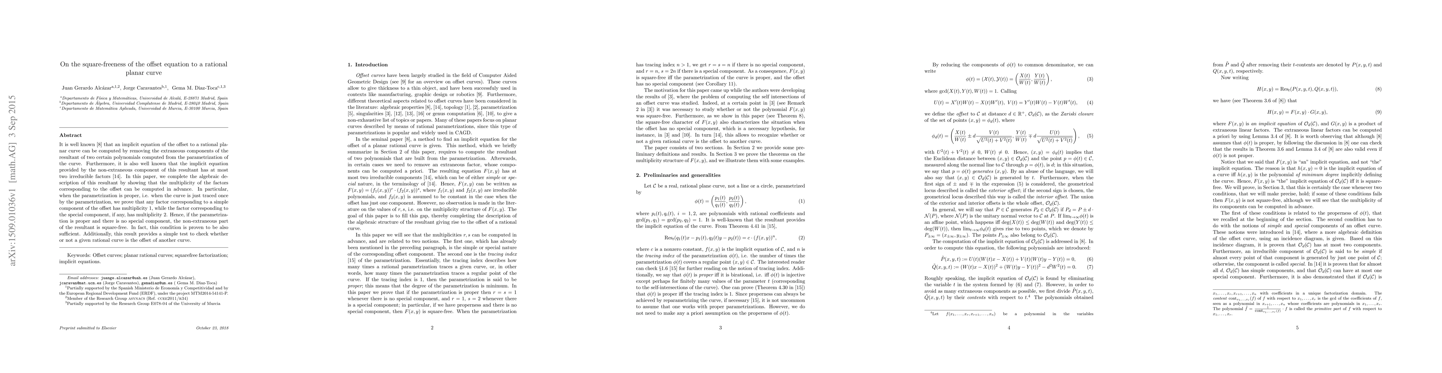 It is well known that an implicit equation of the offset to a rational planar curve can be computed by removing the extraneous components of the resultant of two certain polynomials computed from the parametrization of the curve. Furthermore, it is also well known that the implicit equation provided by the non-extraneous component of this resultant has at most two irreducible factors. In this paper, we complete the algebraic description of this resultant by showing that the multiplicity of the factors corresponding to the offset can be computed in advance. In particular, when the parametrization is proper, i.e. when the curve is just traced once by the parametrization, we prove that any factor corresponding to a simple component of the offset has multiplicity 1, while the factor corresponding to the special component, if any, has multiplicity 2. Hence, if the parametrization is proper and there is no special component, the non-extraneous part of the resultant is square-free. In fact, this condition is proven to be also sufficient. Additionally, this result provides a simple test to check whether or not a given rational curve is the offset of another curve.