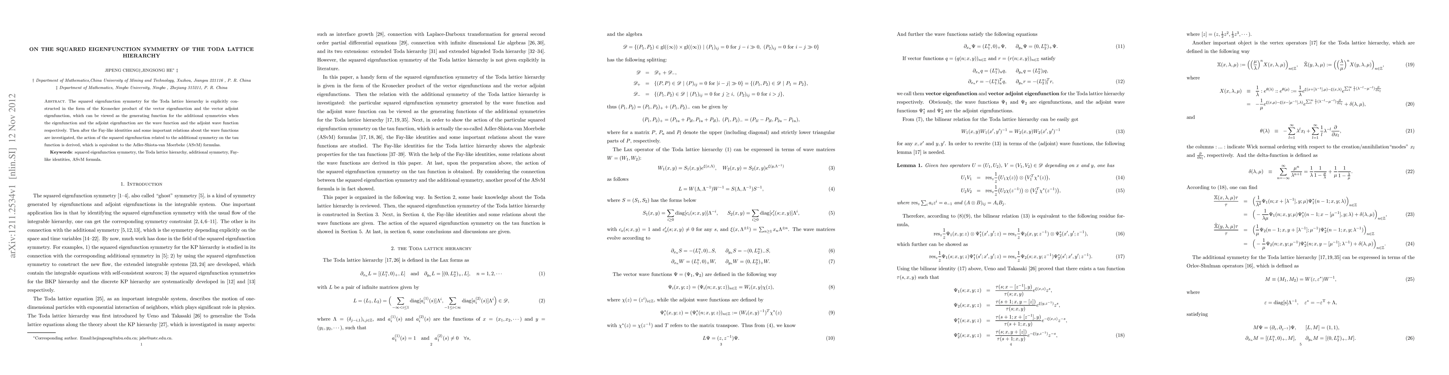 This paper constructs the squared eigenfunction symmetry for the Toda lattice hierarchy using the Kronecker product of eigenfunction and adjoint eigenfunction. It derives the action of this squared eigenfunction on the tau function, equating it to the Adler-Shiota-van Moerbeke formulas, after examining Fay-like identities and wave function relations.