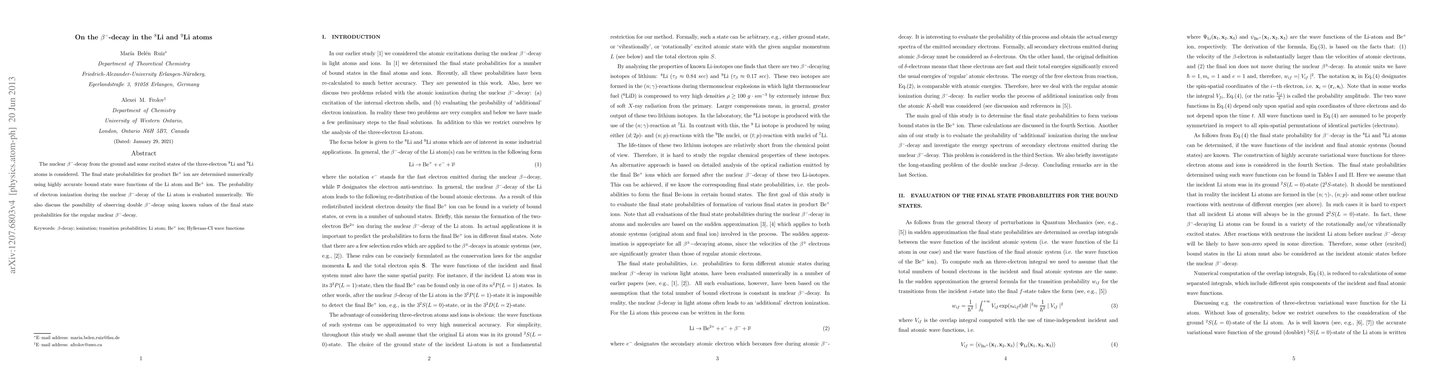 The nuclear {\ss}- decay from the ground and some excited states of the three-electron Li-8 and Li-9 atoms is considered. The final state probabilities for the arising Be+ ion are determined numerically with the use of highly accurate bound state wave functions of the Li atom and Be+ ion. The probability of electron ionization during the nuclear {\ss}- decay of the Li atom is evaluated numerically. We also discuss a possibility to observe the double {\ss}- decay by using the known values of the final state probabilities for the regular nuclear {\ss}- decay.