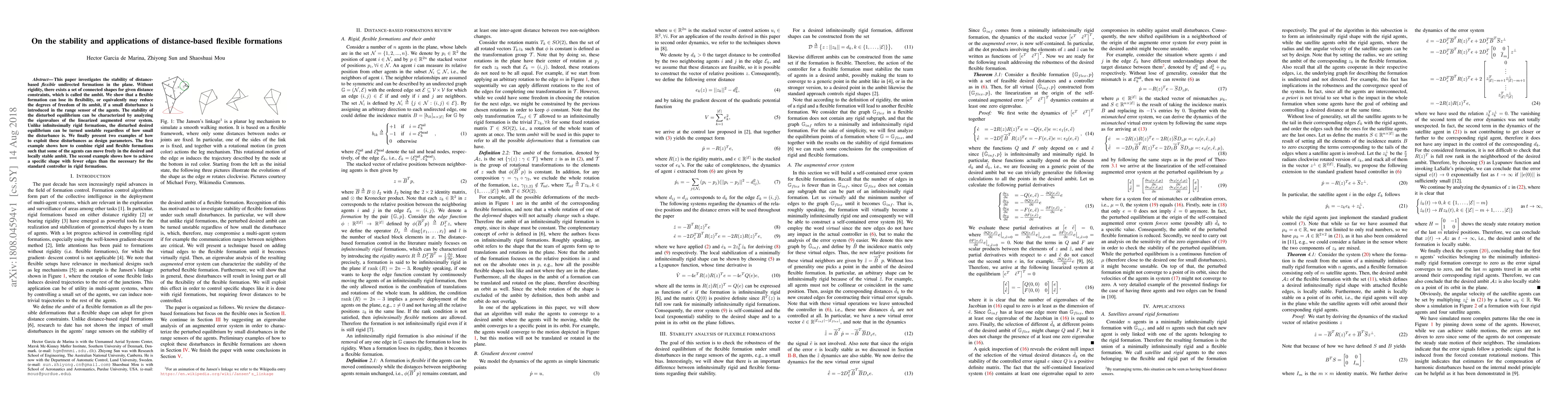 This paper explores the stability of flexible formations in undirected planar formations under distance constraints, revealing that small disturbances can destabilize the equilibrium, unlike rigid formations. It demonstrates how these disturbances can be leveraged to design formations with specific shapes and degrees of freedom.