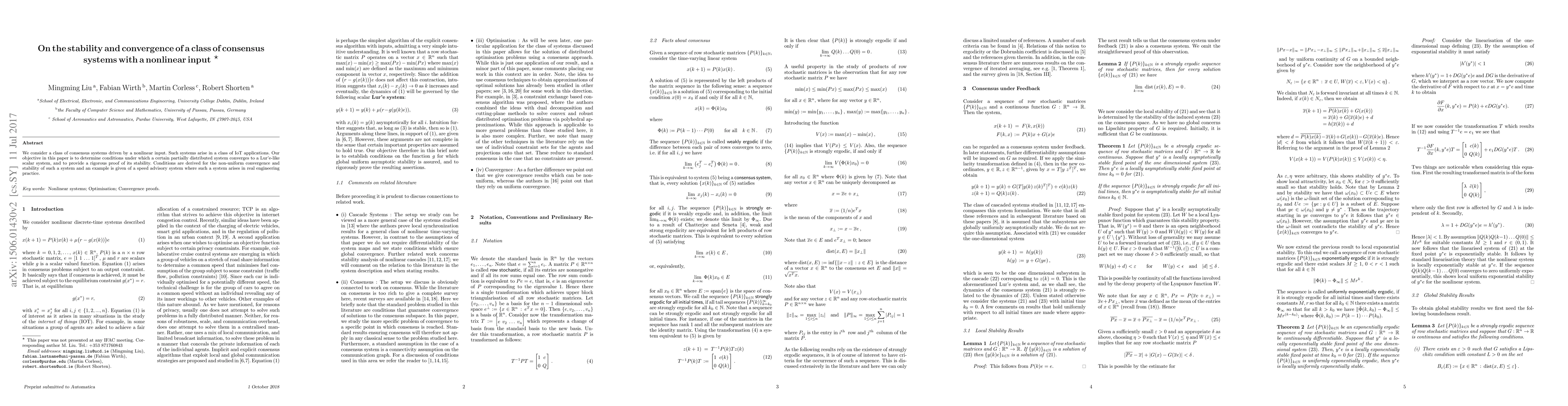 We consider a class of consensus systems driven by a nonlinear input. Such systems arise in a class of IoT applications. Our objective in this paper is to determine conditions under which a certain partially distributed system converges to a Lur'e-like scalar system, and to provide a rigorous proof of its stability. Conditions are derived for the non-uniform convergence and stability of such a system and an example is given of a speed advisory system where such a system arises in real engineering practice.