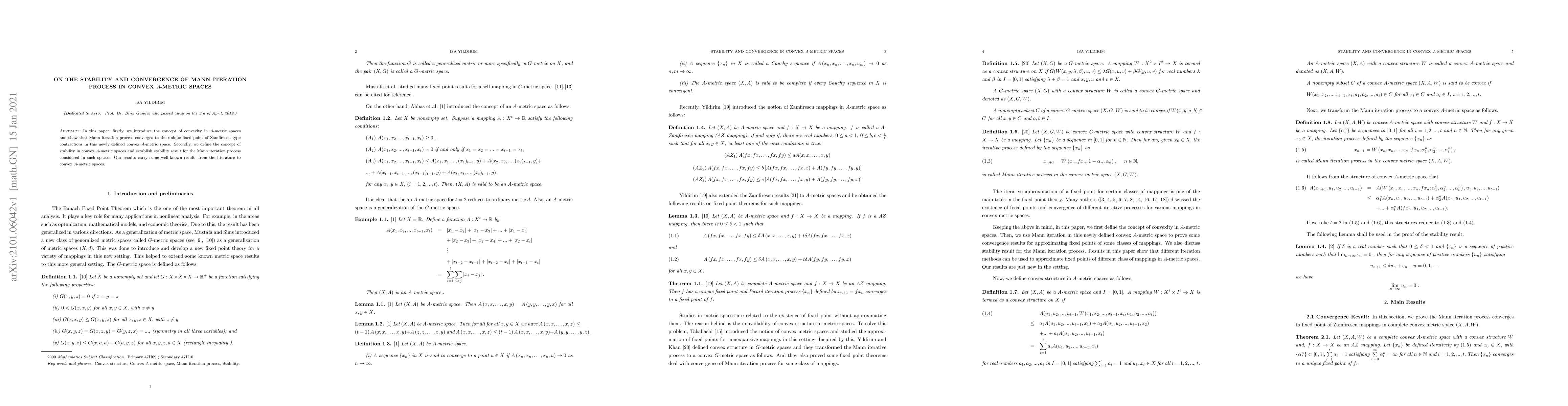 In this paper, firstly, we introduce the concept of convexity in A-metric spaces and show that Mann iteration process converges to the unique fixed point of Zamfirescu type contractions in this newly defined convex A-metric space. Secondly, we define the concept of stability in convex A-metric spaces and establish stability result for the Mann iteration process considered in such spaces. Our results carry some well-known results from the literature to convex A-metric spaces.