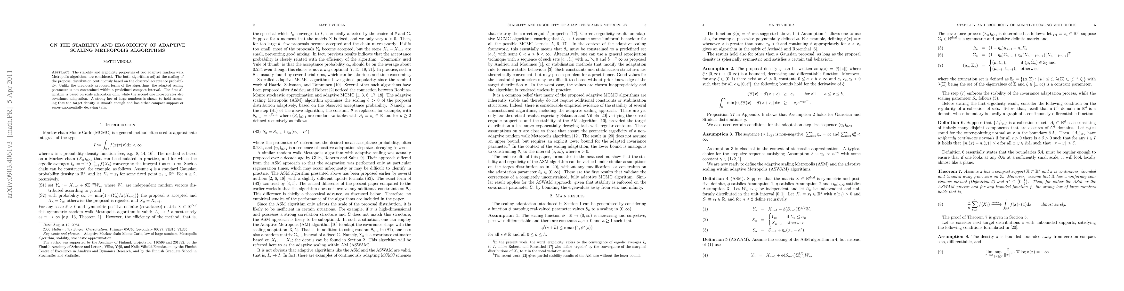 Two adaptive random walk Metropolis algorithms were studied for their stability and ergodicity, with one incorporating scale adaptation and the other covariance adaptation. A strong law of large numbers was shown to hold under certain conditions.