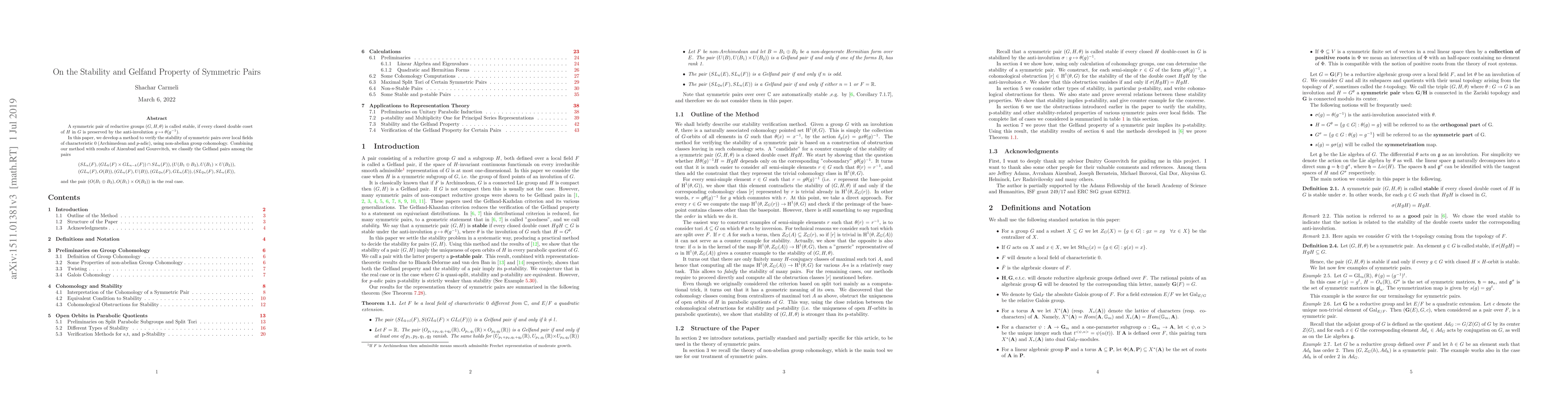 This paper develops a method to verify the stability of symmetric pairs of reductive groups over local fields using non-abelian group cohomology, and classifies several specific pairs as Gelfand pairs based on the results of Aizenbud and Gourevitch.