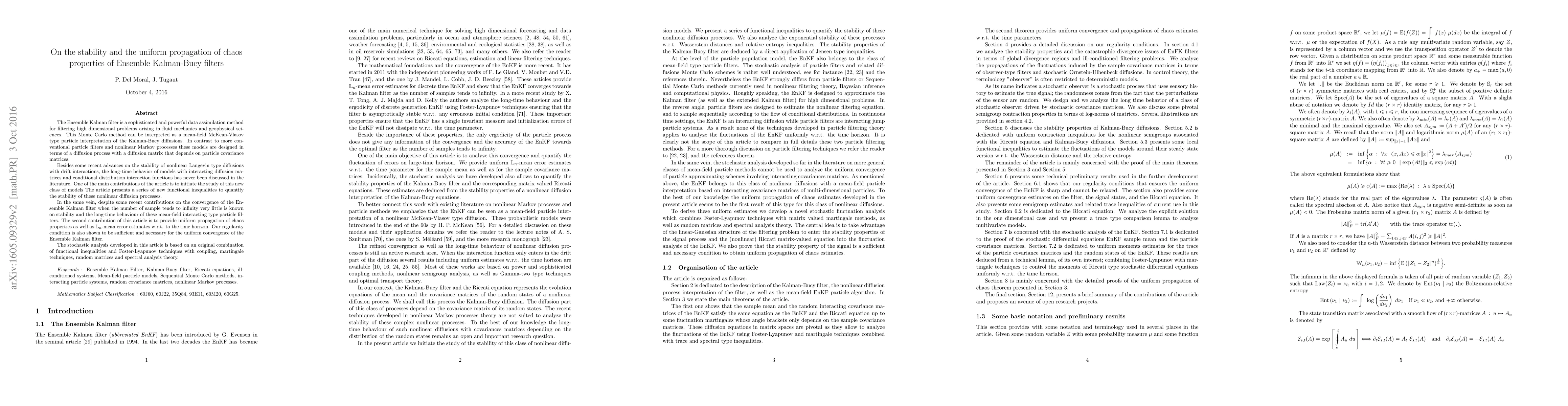 The Ensemble Kalman filter is a sophisticated and powerful data assimilation method for filtering high dimensional problems arising in fluid mechanics and geophysical sciences. This Monte Carlo method can be interpreted as a mean-field McKean-Vlasov type particle interpretation of the Kalman-Bucy diffusions. In contrast to more conventional particle filters and nonlinear Markov processes these models are designed in terms of a diffusion process with a diffusion matrix that depends on particle covariance matrices. Besides some recent advances on the stability of nonlinear Langevin type diffusions with drift interactions, the long-time behaviour of models with interacting diffusion matrices and conditional distribution interaction functions has never been discussed in the literature. One of the main contributions of the article is to initiate the study of this new class of models The article presents a series of new functional inequalities to quantify the stability of these nonlinear diffusion processes. In the same vein, despite some recent contributions on the convergence of the Ensemble Kalman filter when the number of sample tends to infinity very little is known on stability and the long-time behaviour of these mean-field interacting type particle filters. The second contribution of this article is to provide uniform propagation of chaos properties as well as Lp-mean error estimates w.r.t. to the time horizon. Our regularity condition is also shown to be sufficient and necessary for the uniform convergence of the Ensemble Kalman filter. The stochastic analysis developed in this article is based on an original combination of functional inequalities and Foster-Lyapunov techniques with coupling, martingale techniques, random matrices and spectral analysis theory.