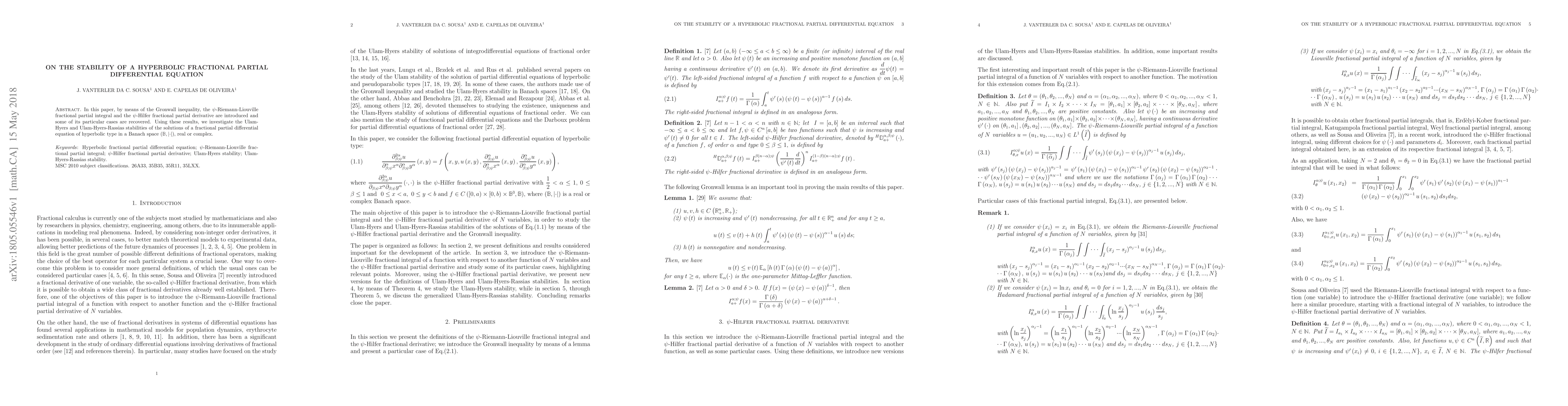 In this paper, by means of the Gronwall inequality, the {\psi}-Riemann-Liouville fractional partial integral and the {\psi}-Hilfer fractional partial derivative are introduced and some of its particular cases are recovered. Using these results, we investigate the Ulam-Hyers and Ulam-Hyers-Rassias stabilities of the solutions of a fractional partial differential equation of hyperbolic type in a Banach space (B, |.|), real or complex.