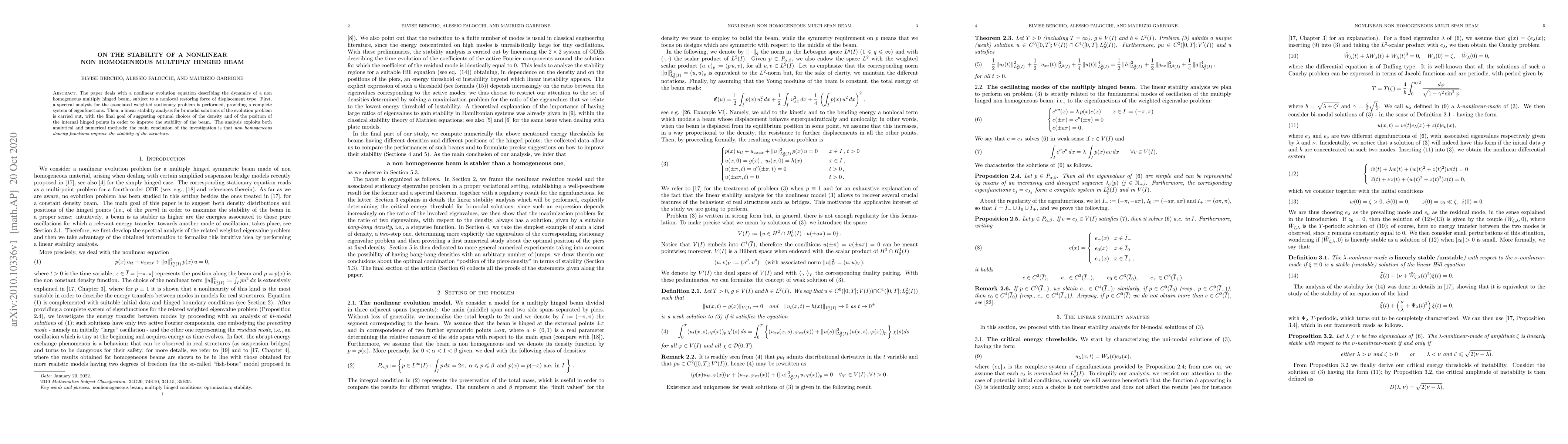 The paper deals with a nonlinear evolution equation describing the dynamics of a non homogeneous multiply hinged beam, subject to a nonlocal restoring force of displacement type. First, a spectral analysis for the associated weighted stationary problem is performed, providing a complete system of eigenfunctions. Then, a linear stability analysis for bi-modal solutions of the evolution problem is carried out, with the final goal of suggesting optimal choices of the density and of the position of the internal hinged points in order to improve the stability of the beam. The analysis exploits both analytical and numerical methods; the main conclusion of the investigation is that non homogeneous density functions improve the stability of the structure.