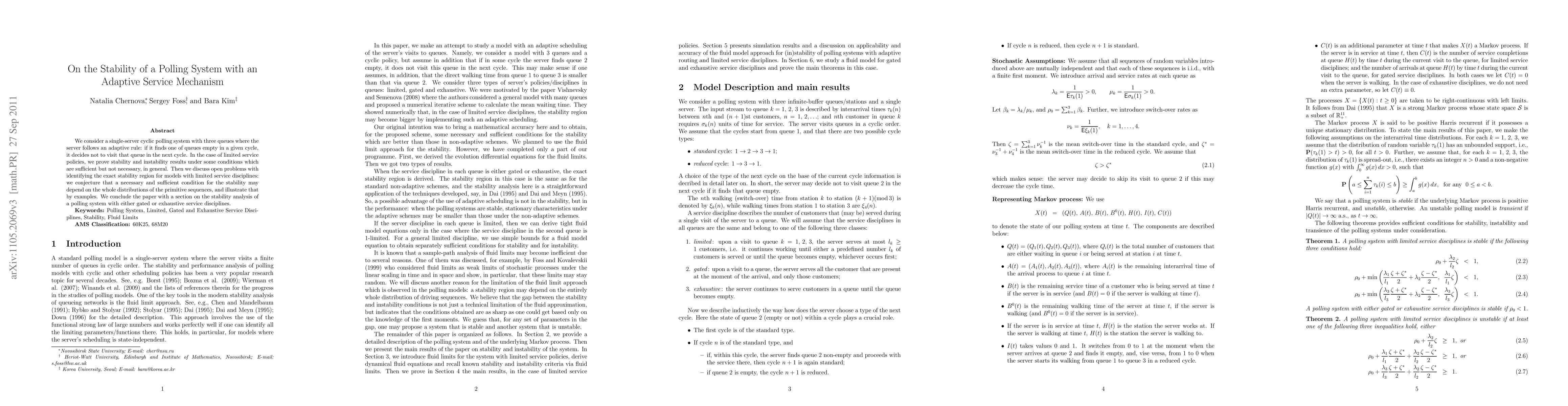 This paper investigates the stability of a single-server cyclic polling system with three queues and an adaptive service mechanism. It proves stability and instability under certain conditions for limited service policies, and conjectures that stability may depend on the entire distributions of primitive sequences, while also analyzing gated and exhaustive service disciplines.