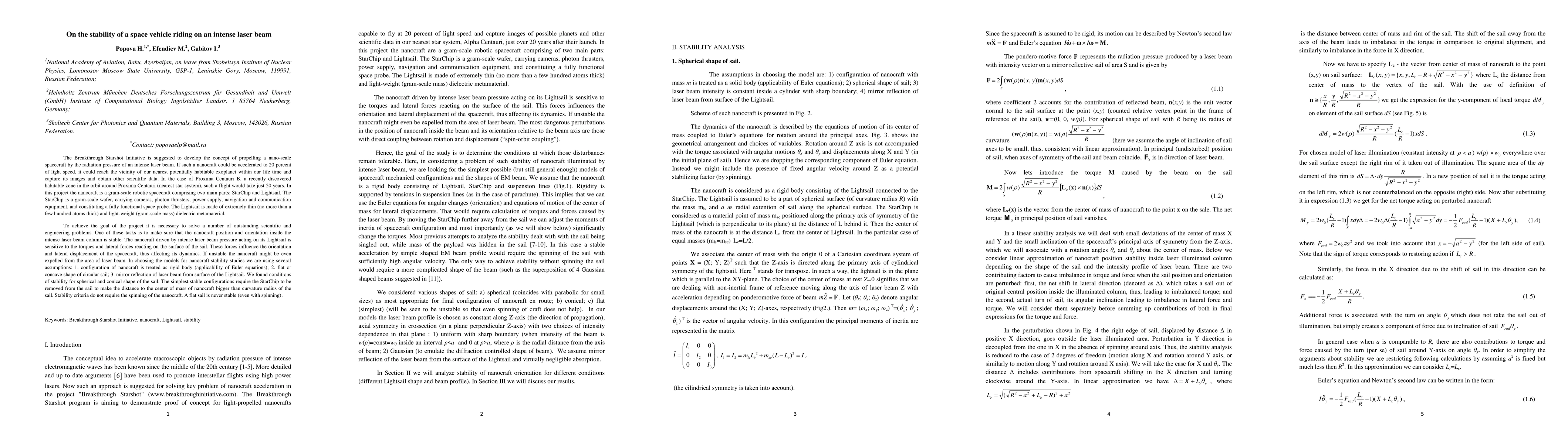 The Breakthrough Starshot Initiative is suggested to develop the concept of propelling a nano-scale spacecraft by the radiation pressure of an intense laser beam. If such a nanocraft could be accelerated to 20 percent of light speed, it could reach the vicinity of our nearest potentially habitable exoplanet within our life time and capture its images and obtain other scientific data. In this project the nanocraft is a gram-scale robotic spacecraft comprising two main parts: StarChip and Lightsail. To achieve the goal of the project it is necessary to solve a number of outstanding scientific problems. One of these tasks is to make sure that the nanocraft position and orientation inside the intense laser beam column is stable. The nanocraft driven by intense laser beam pressure acting on its Lightsail is sensitive to the torques and lateral forces reacting on the surface of the sail. These forces influence the orientation and lateral displacement of the spacecraft, thus affecting its dynamics. If unstable the nanocraft might be expelled from the area of laser beam. In choosing the models for nanocraft stability studies we are using several assumptions: 1. configuration of nanocraft is treated as rigid body (applicability of Euler equations); 2. flat or concave shape of circular sail; 3. mirror reflection of laser beam from surface of the Lightsail. We found conditions of position stability for spherical and conical shape of the sail. The simplest stable configurations require the StarChip to be removed from the sail to make the distance to the center of mass of nanocraft bigger than curvature radius of the sail. Stability criteria do not require the spinning of the nanocraft. A flat sail is never stable (even with spinning).