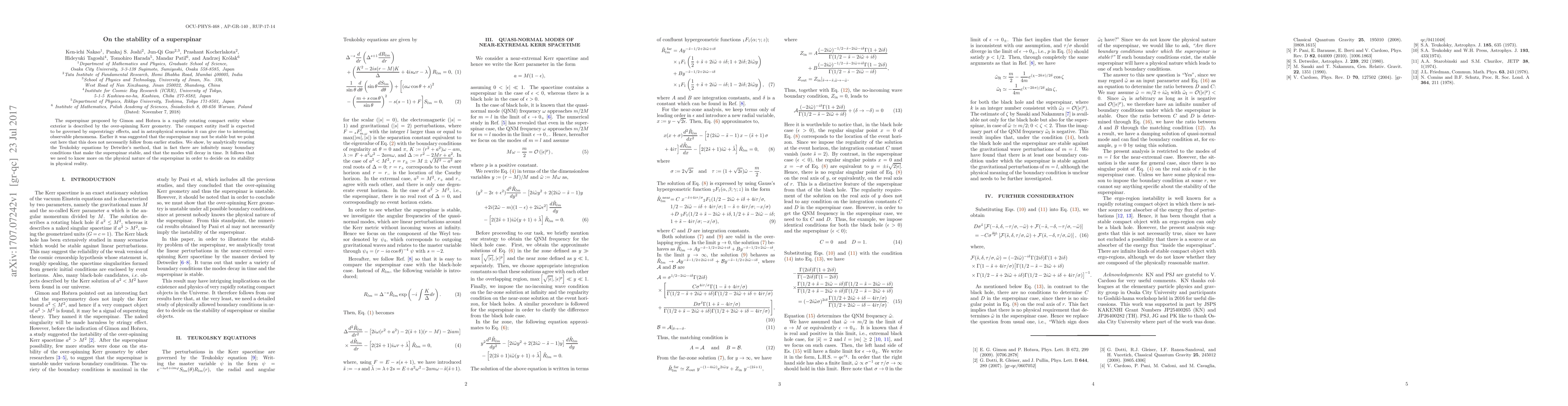 The superspinar proposed by Gimon and Horava is a rapidly rotating compact entity whose exterior is described by the over-spinning Kerr geometry. The compact entity itself is expected to be governed by superstringy effects, and in astrophysical scenarios it can give rise to interesting observable phenomena. Earlier it was suggested that the superspinar may not be stable but we point out here that this does not necessarily follow from earlier studies. We show, by analytically treating the Teukolsky equations by Detwiler's method, that in fact there are infinitely many boundary conditions that make the superspinar stable, and that the modes will decay in time. It follows that we need to know more on the physical nature of the superspinar in order to decide on its stability in physical reality.