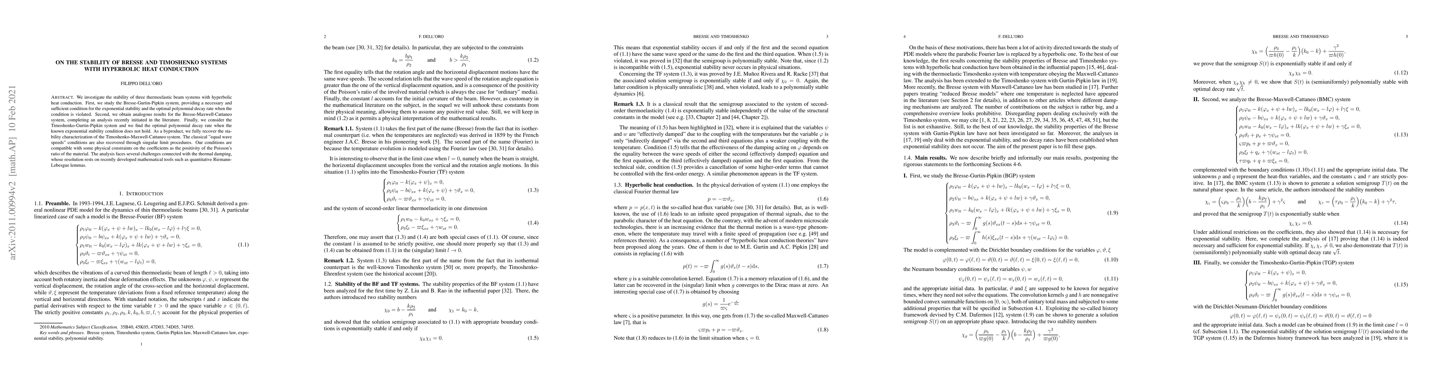 This paper investigates the stability of three thermoelastic beam systems with hyperbolic heat conduction, providing necessary and sufficient conditions for exponential stability and optimal decay rates for the Bresse-Gurtin-Pipkin, Bresse-Maxwell-Cattaneo, and Timoshenko-Gurtin-Pipkin systems, and recovering classical stability conditions through singular limit procedures.