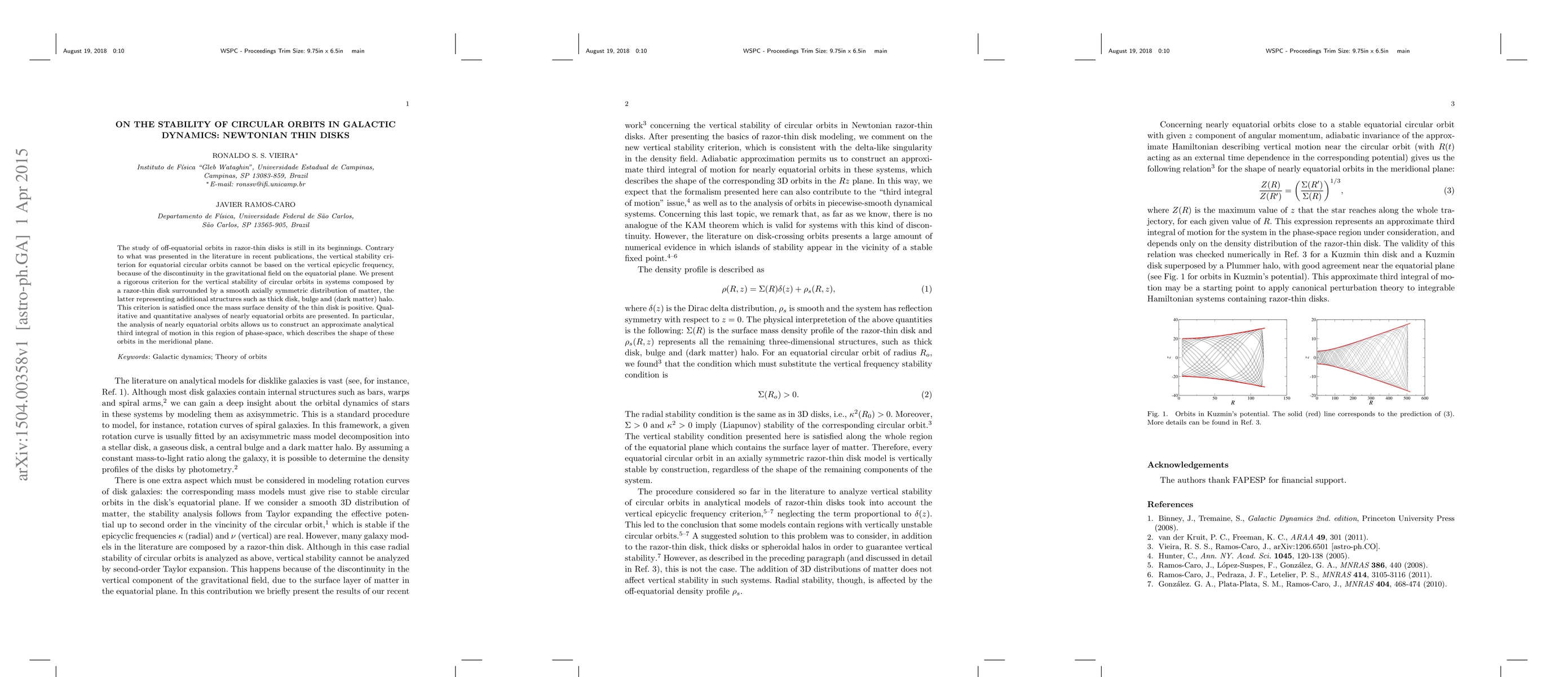 The study of off-equatorial orbits in razor-thin disks is still in its beginnings. Contrary to what was presented in the literature in recent publications, the vertical stability criterion for equatorial circular orbits cannot be based on the vertical epicyclic frequency, because of the discontinuity in the gravitational field on the equatorial plane. We present a rigorous criterion for the vertical stability of circular orbits in systems composed by a razor-thin disk surrounded by a smooth axially symmetric distribution of matter, the latter representing additional structures such as thick disk, bulge and (dark matter) halo. This criterion is satisfied once the mass surface density of the thin disk is positive. Qualitative and quantitative analyses of nearly equatorial orbits are presented. In particular, the analysis of nearly equatorial orbits allows us to construct an approximate analytical third integral of motion in this region of phase-space, which describes the shape of these orbits in the meridional plane.