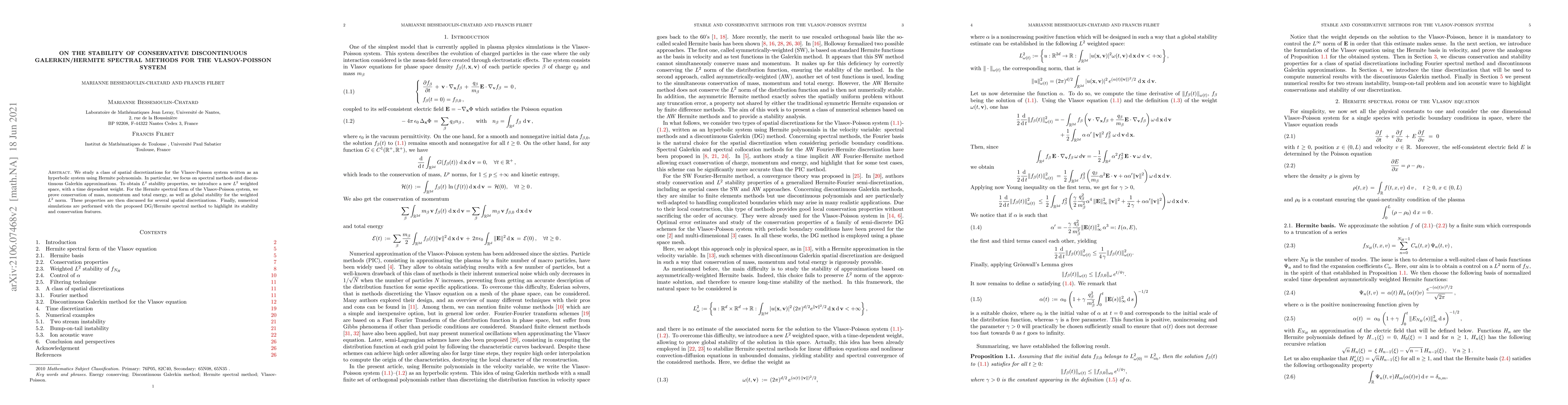 We study a class of spatial discretizations for the Vlasov-Poisson system written as an hyperbolic system using Hermite polynomials. In particular, we focus on spectral methods and discontinuous Galerkin approximations. To obtain L 2 stability properties, we introduce a new L 2 weighted space, with a time dependent weight. For the Hermite spectral form of the Vlasov-Poisson system, we prove conservation of mass, momentum and total energy, as well as global stability for the weighted L 2 norm. These properties are then discussed for several spatial discretizations. Finally, numerical simulations are performed with the proposed DG/Hermite spectral method to highlight its stability and conservation features.