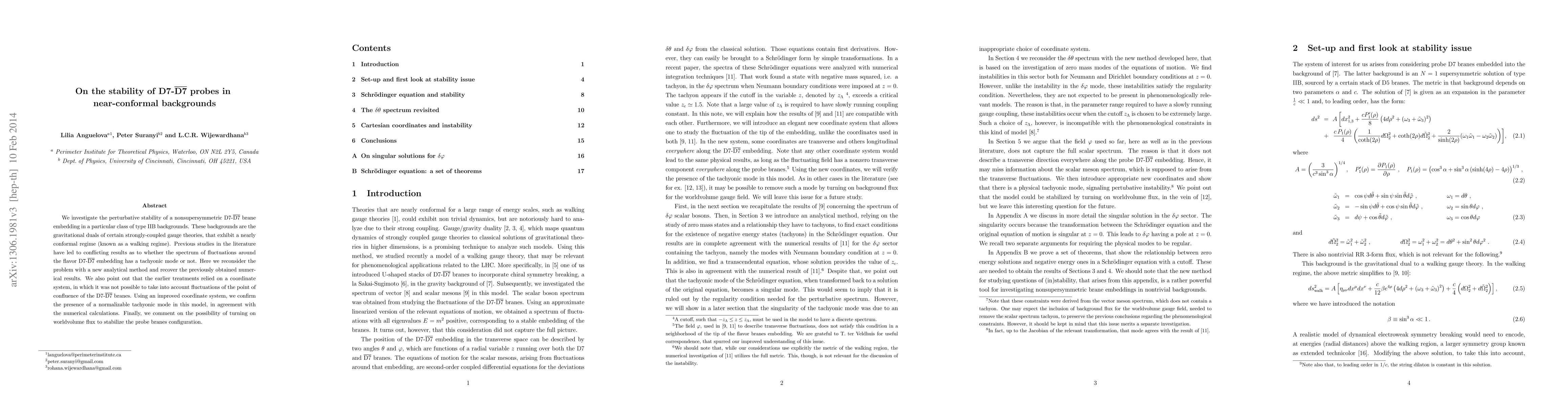 This paper investigates the stability of nonsupersymmetric D7-anti-D7 brane probes in near-conformal type IIB backgrounds, confirming the existence of a normalizable tachyonic mode using an improved analytical method. It also discusses the potential stabilization via worldvolume flux.