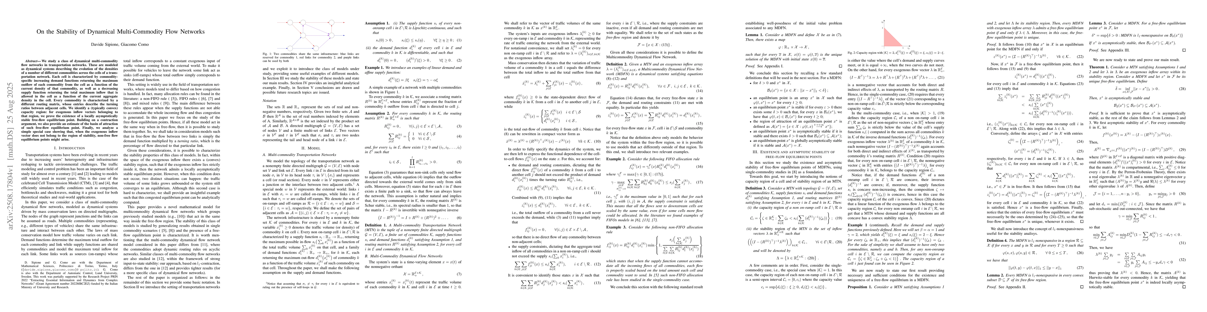 We study a class of dynamical multi-commodity flow networks in transportation networks. These are modeled as dynamical systems describing the evolution of the densities of a number of different commodities across the cells of a transportation network. Each cell is characterized by commodity-specific increasing demand functions returning the maximum outflow of each commodity from the cell as a function of the current density of that commodity, as well as a decreasing supply function returning the total maximum inflow that is allowed in the cell as a function of the current aggregate density in the cell. Every commodity is characterized by a different routing matrix, whose entries describe the turning ratios between adjacent cells. We identify a (typically convex) capacity region: for exogenous inflow vectors belonging to that region, we prove the existence of a locally asymptotically stable free-flow equilibrium point. Building on a contraction argument, we also provide an estimate of the basin of attraction of such free-flow equilibrium point. Finally, we analyze a simple special case showing that, when the exogenous inflow vector does not belong to the region of stability, non-free flow equilibrium points might arise.
