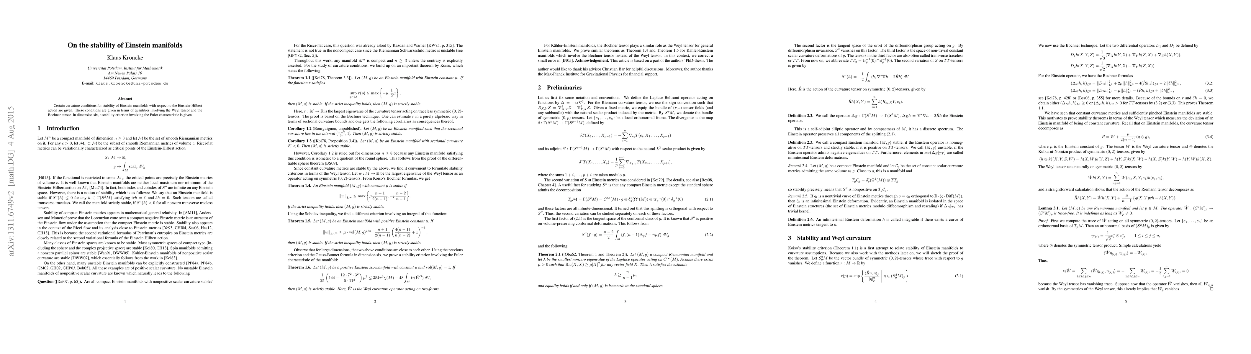 Researchers provide stability conditions for Einstein manifolds in terms of Weyl and Bochner tensors, with a new criterion involving Euler characteristic in dimension six.