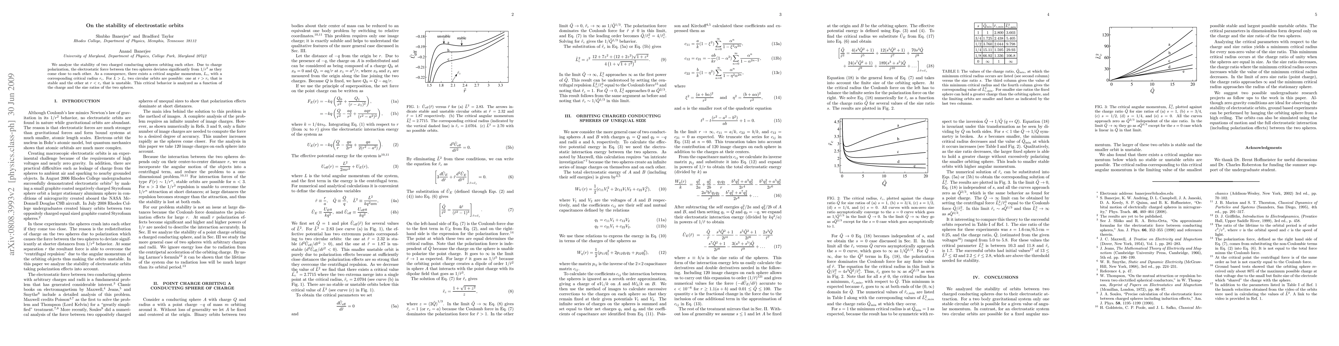 We analyze the stability of two charged conducting spheres orbiting each other. Due to charge polarization, the electrostatic force between the two spheres deviates significantly from $1/r^2$ as they come close to each other. As a consequence, there exists a critical angular momentum, $L_c$, with a corresponding critical radius $r_c$. For $L > L_c$ two circular orbits are possible: one at $r > r_c$ that is stable and the other at $r < r_c$ that is unstable. This critical behavior is analyzed as a function of the charge and the size ratios of the two spheres.