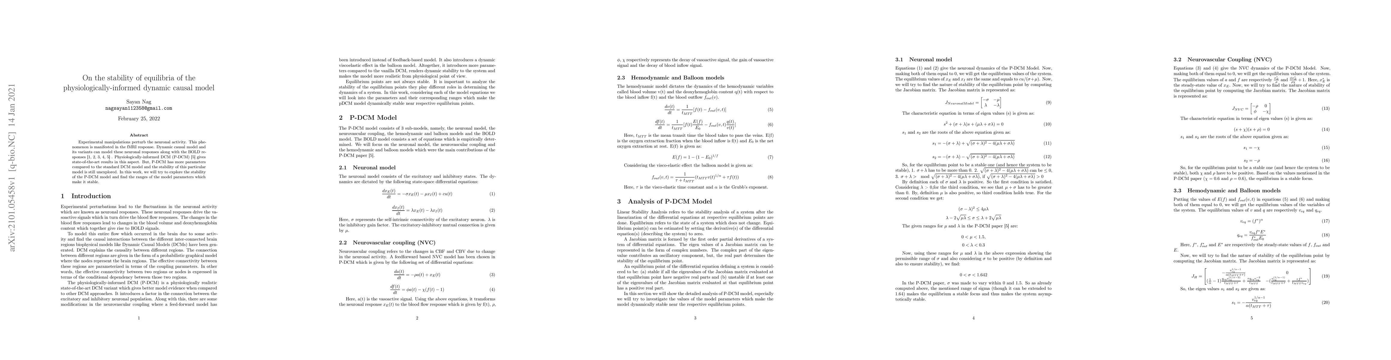 Experimental manipulations perturb the neuronal activity. This phenomenon is manifested in the fMRI response. Dynamic causal model and its variants can model these neuronal responses along with the BOLD responses [1, 2, 3, 4, 5] . Physiologically-informed DCM (P-DCM) [5] gives state-of-the-art results in this aspect. But, P-DCM has more parameters compared to the standard DCM model and the stability of this particular model is still unexplored. In this work, we will try to explore the stability of the P-DCM model and find the ranges of the model parameters which make it stable.