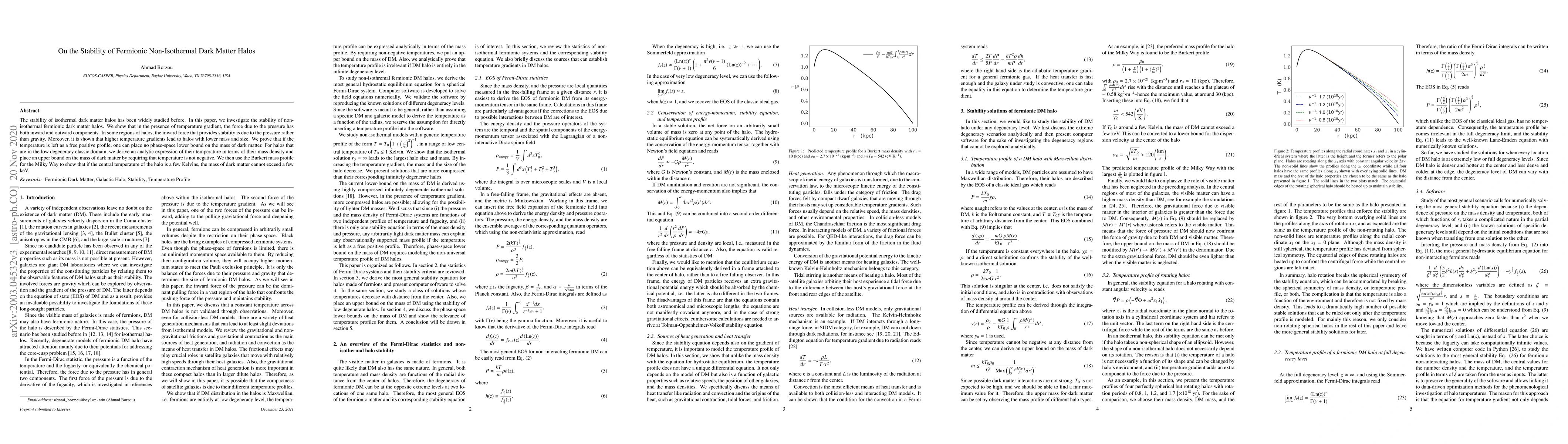 This paper explores the stability of non-isothermal fermionic dark matter halos, demonstrating that pressure forces can provide stability through inward components, and higher temperature gradients result in smaller, less massive halos. It also establishes an upper mass limit for dark matter under certain conditions.