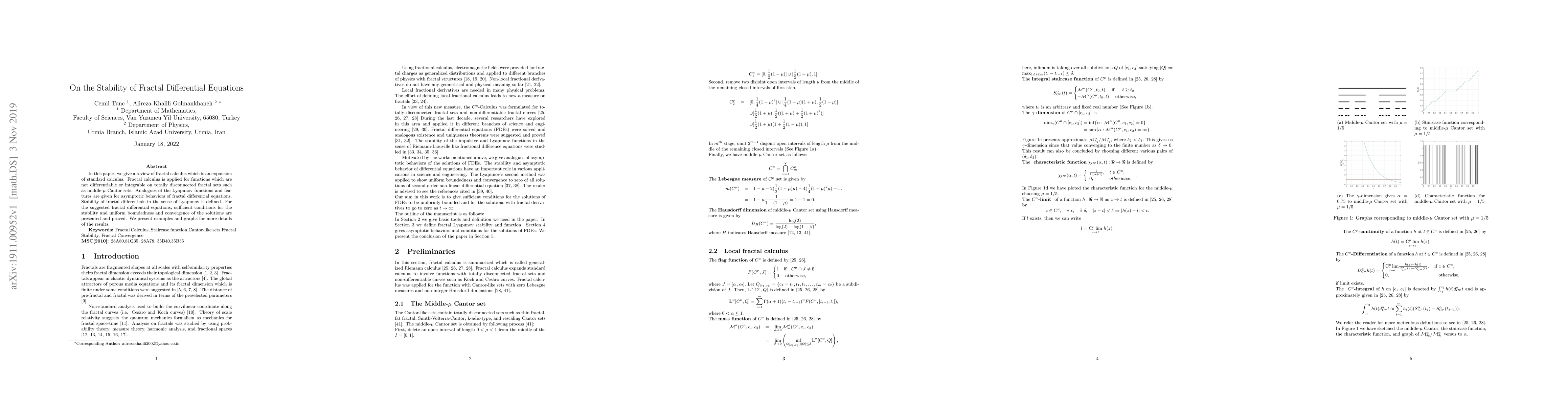 In this paper, we give a review of fractal calculus which is an expansion of standard calculus. Fractal calculus is applied for functions which are not differentiable or integrable on totally disconnected fractal sets such as middle-$\mu$ Cantor sets. Analogues of the Lyapunov functions and features are given for asymptotic behaviors of fractal differential equations. Stability of fractal differentials in the sense of Lyapunov is defined. For the suggested fractal differential equations, sufficient conditions for the stability and uniform boundedness and convergence of the solutions are presented and proved. We present examples and graphs for more details of the results.