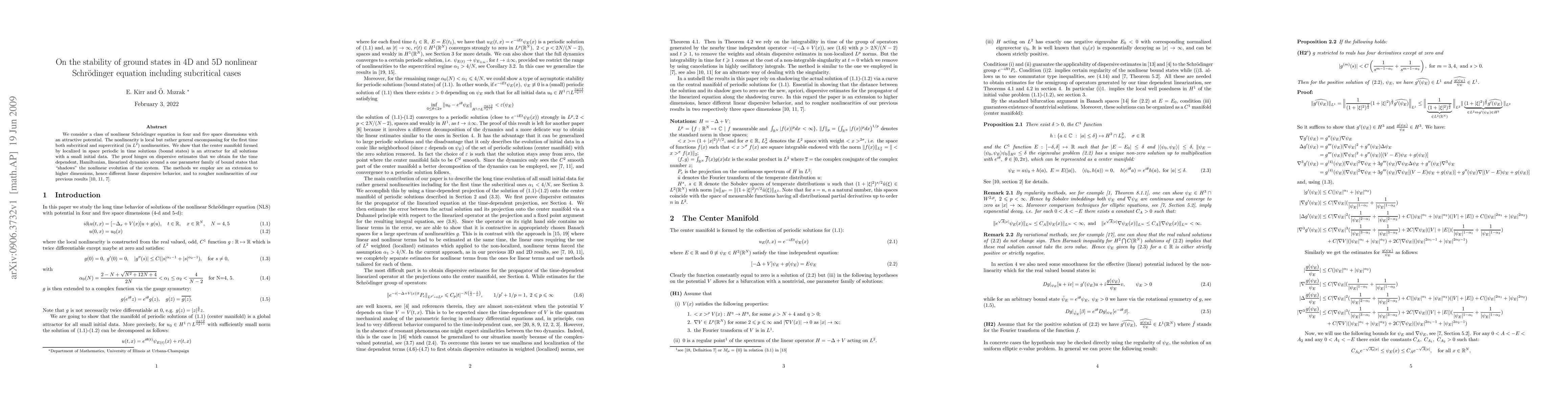 We consider a class of nonlinear Schrodinger equation in four and five space dimensions with an attractive potential. The nonlinearity is local but rather general encompassing for the first time both subcritical and supercritical (in L2) nonlinearities. We show that the center manifold formed by localized in space periodic in time solutions (bound states) is an attractor for all solutions with a small initial data. The proof hinges on dispersive estimates that we obtain for the time dependent, Hamiltonian, linearized dynamics around a one parameter family of bound states that "shadows" the nonlinear evolution of the system. The methods we employ are an extension to higher dimensions, hence different linear dispersive behavior, and to rougher nonlinearities of our previous results [10, 11, 7].