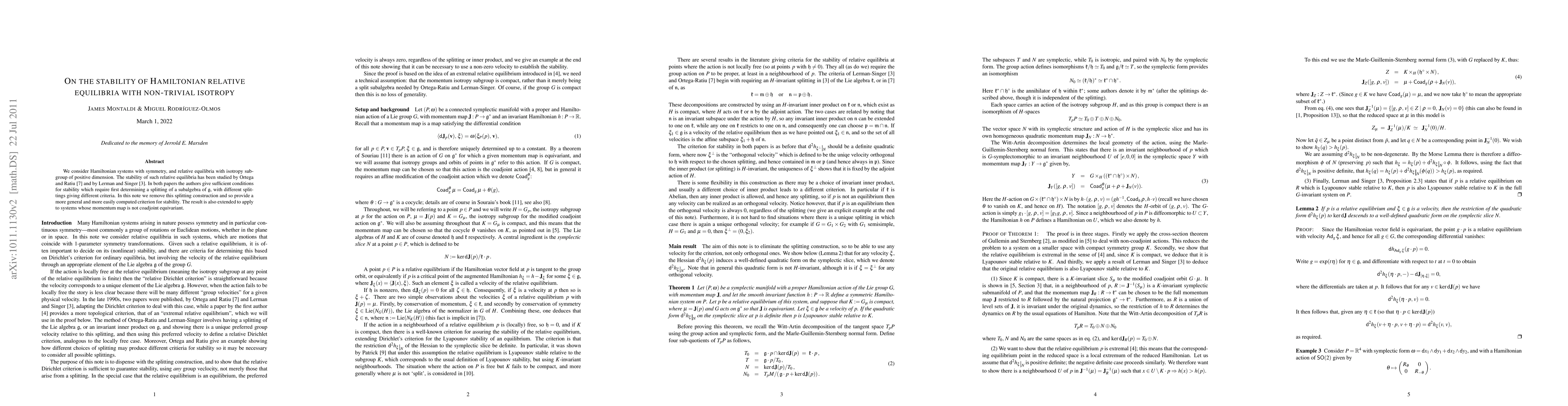 This paper presents a new criterion for the stability of Hamiltonian relative equilibria with non-trivial isotropy, eliminating the need for complex splitting constructions. It extends the applicability to systems where the momentum map is not coadjoint equivariant.