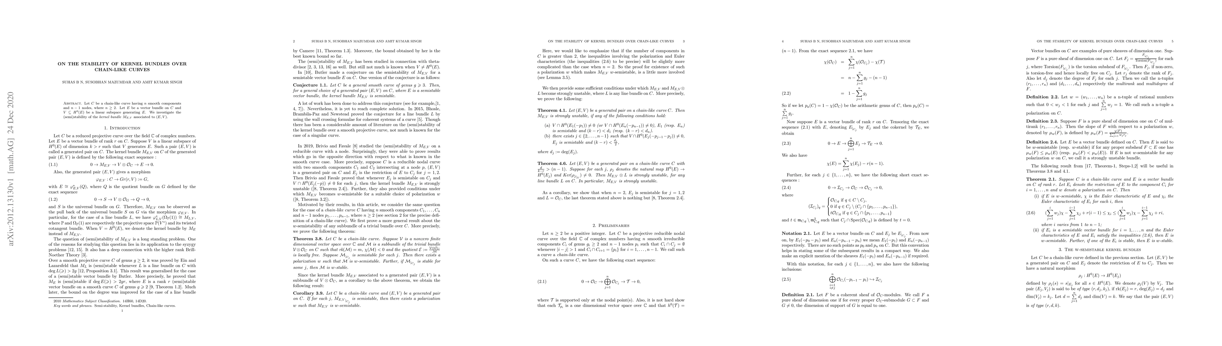 Let $C$ be a chain-like curve having $n$ smooth components and $n-1$ nodes, where $n \geq 2$. Let $E$ be a vector bundle on $C$ and $V \subseteq H^0(E)$ be a linear subspace generating $E$. We investigate the (semi)stability of the kernel bundle $M_{E,V}$ associated to $(E,V)$.