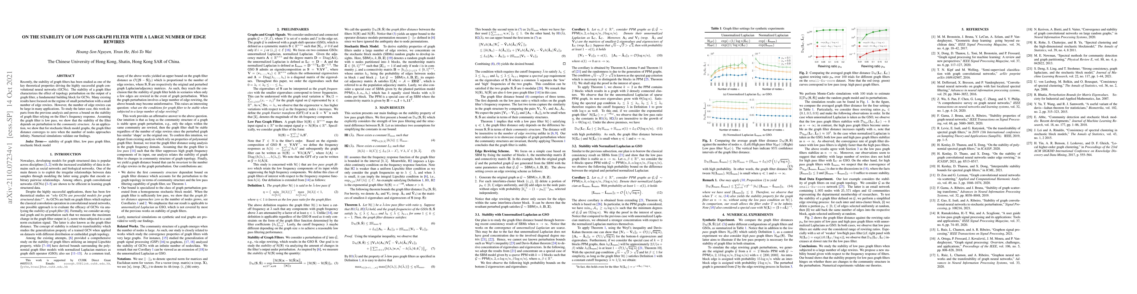 This paper investigates the stability of low pass graph filters under large perturbations due to numerous edge rewires, proving a stability bound based on the filter's frequency response. It demonstrates that stability depends on changes to community structure, showing convergence for stochastic block model graphs as node count increases, validated by numerical simulations.