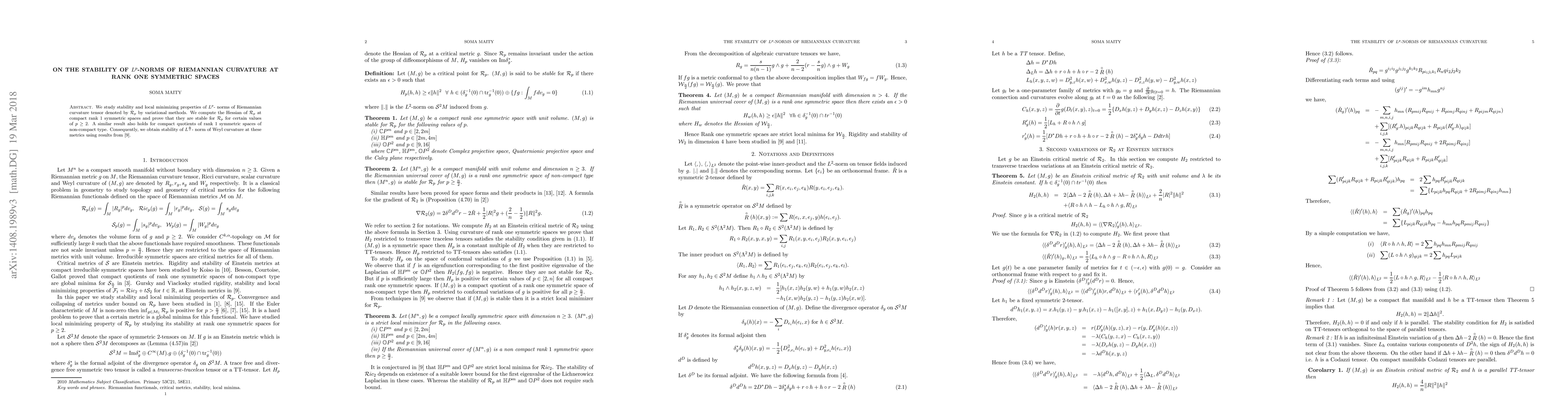 This research investigates the stability of L^p-norms of curvature tensors in rank one symmetric spaces using variational methods. It proves stability for certain p > 2 and extends this to compact quotients of non-compact type, ensuring the stability of L^{n/2}-norm of Weyl curvature at specific metrics.