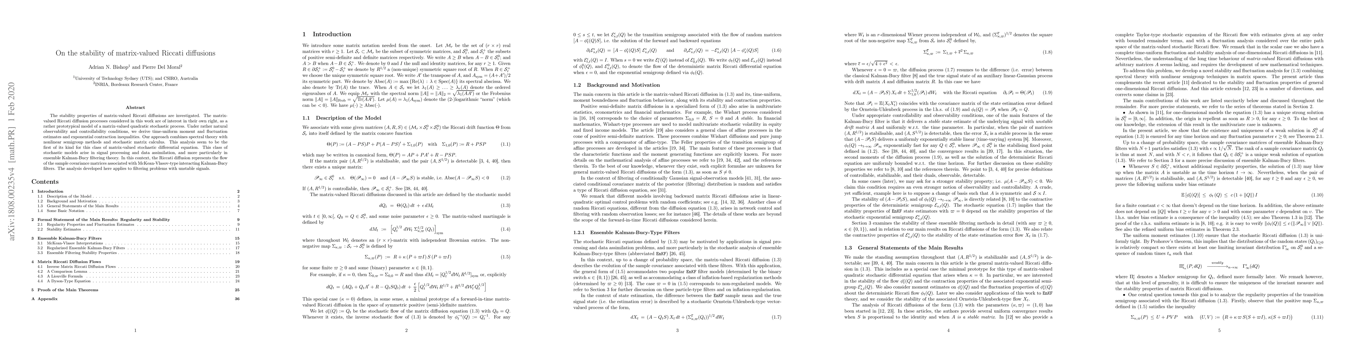 This paper investigates the stability of matrix-valued Riccati diffusions, deriving time-uniform moment and fluctuation estimates under observability and controllability conditions. The analysis combines spectral theory, nonlinear semigroup methods, and stochastic matrix calculus, applicable to signal processing and ensemble Kalman-Bucy filtering.