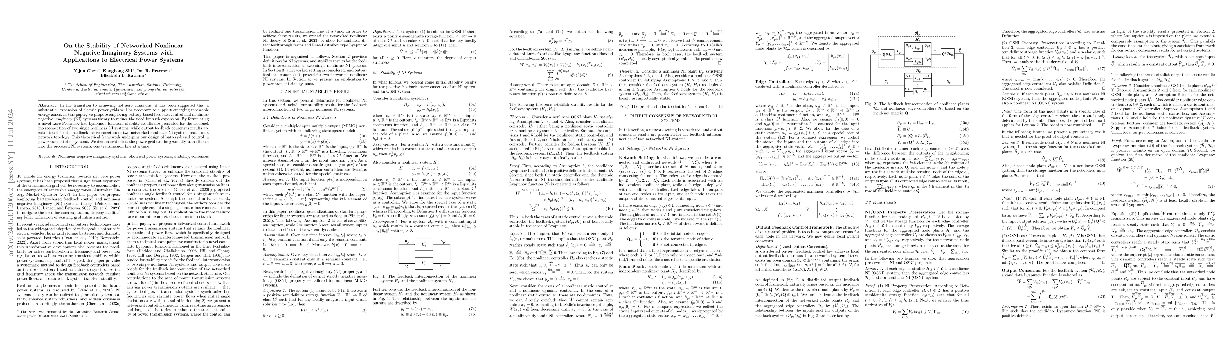 In the transition to achieving net zero emissions, it has been suggested that a substantial expansion of electric power grids will be necessary to support emerging renewable energy zones. In this paper, we propose employing battery-based feedback control and nonlinear negative imaginary (NI) systems theory to reduce the need for such expansion. By formulating a novel Lur\'e-Postnikov-like Lyapunov function, stability results are presented for the feedback interconnection of two single nonlinear NI systems, while output feedback consensus results are established for the feedback interconnection of two networked nonlinear NI systems based on a network topology. This theoretical framework underpins our design of battery-based control in power transmission systems. We demonstrate that the power grid can be gradually transitioned into the proposed NI systems, one transmission line at a time.