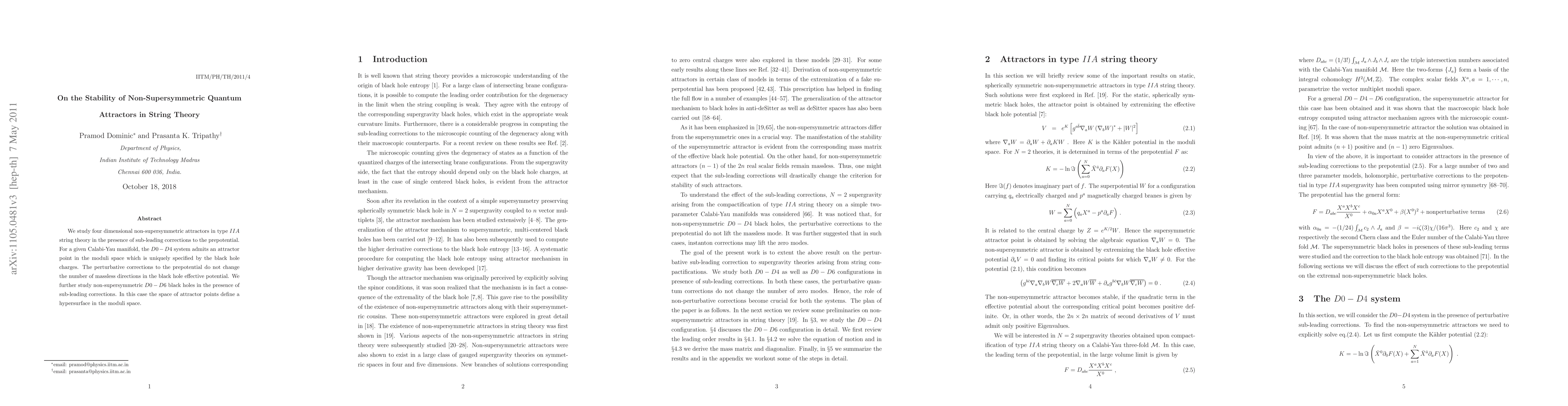 This research investigates four-dimensional non-supersymmetric attractors in type IIA string theory, focusing on D0-D4 systems on Calabi-Yau manifolds with sub-leading corrections to the prepotential. It finds that these corrections do not alter the number of massless directions in the black hole potential, and similarly examines non-supersymmetric D0-D6 black holes, where attractor points form a hypersurface in the moduli space.