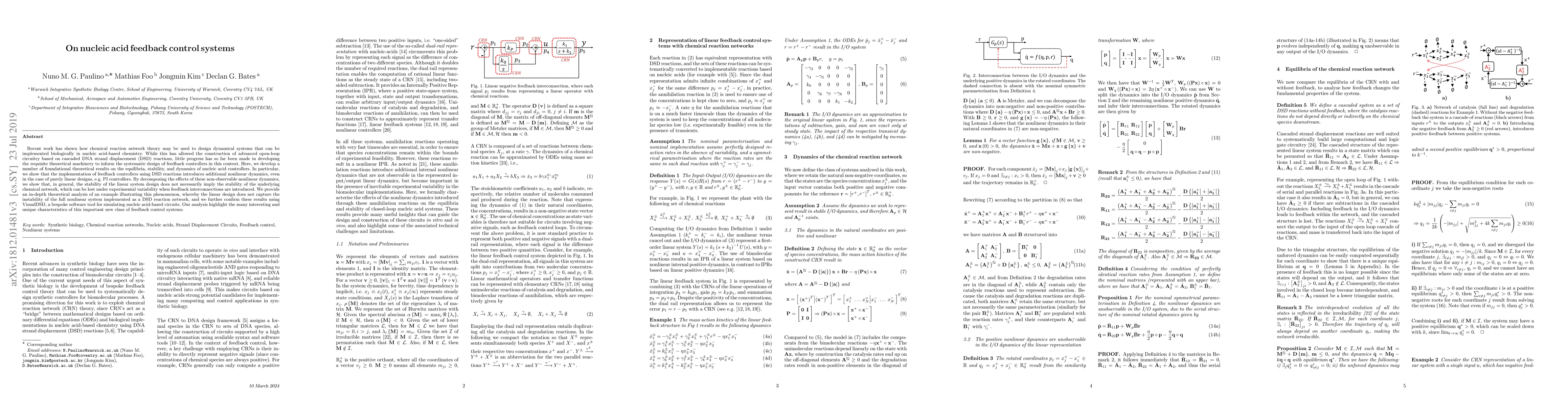 Recent work has shown how chemical reaction network theory may be used to design dynamical systems that can be implemented biologically in nucleic acid-based chemistry. While this has allowed the construction of advanced open-loop circuitry based on cascaded DNA strand displacement (DSD) reactions, little progress has so far been made in developing the requisite theoretical machinery to inform the systematic design of feedback controllers in this context. Here, we develop a number of foundational theoretical results on the equilibria, stability, and dynamics of nucleic acid controllers. In particular, we show that the implementation of feedback controllers using DSD reactions introduces additional nonlinear dynamics, even in the case of purely linear designs, e.g. PI controllers. By decomposing the effects of these non-observable nonlinear dynamics, we show that, in general, the stability of the linear system design does not necessarily imply the stability of the underlying chemical network, which can be lost under experimental variability when feedback interconnections are introduced. We provide an in-depth theoretical analysis of an example illustrating this phenomenon, whereby the linear design does not capture the instability of the full nonlinear system implemented as a DSD reaction network, and we further confirm these results using VisualDSD, a bespoke software tool for simulating nucleic acid-based circuits. Our analysis highlight the many interesting and unique characteristics of this important new class of feedback control systems.