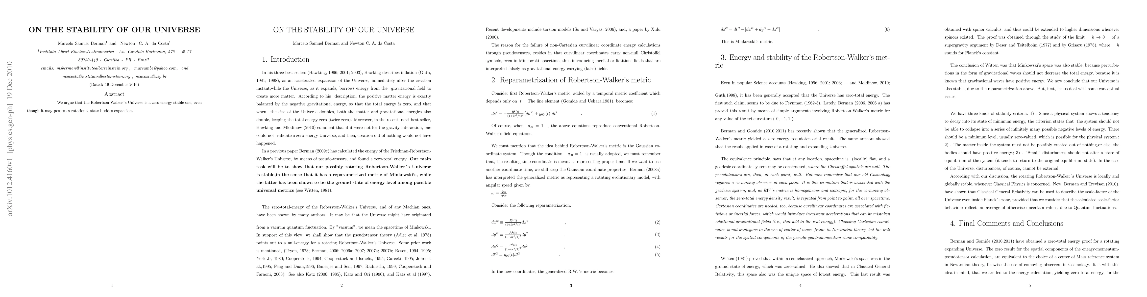 We argue that the Robertson-Walker's Universe is a zero-energy stable one, even though it may possess a rotational state besides expansion.