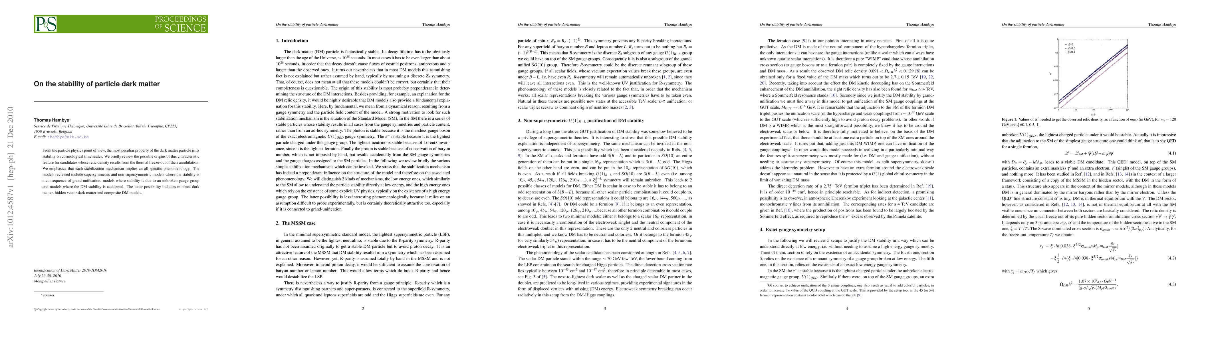 From the particle physics point of view, the most peculiar property of the dark matter particle is its stability on cosmological time scales. We briefly review the possible origins of this characteristic feature for candidates whose relic density results from the thermal freeze-out of their annihilation. We emphasize that each stabilization mechanism implies an all specific phenomenology. The models reviewed include supersymmetric and non-supersymmetric models where the stability is a consequence of grand-unification, models where stability is due to an unbroken gauge group and models where the DM stability is accidental. The latter possibility includes minimal dark matter, hidden vector dark matter and composite DM models.