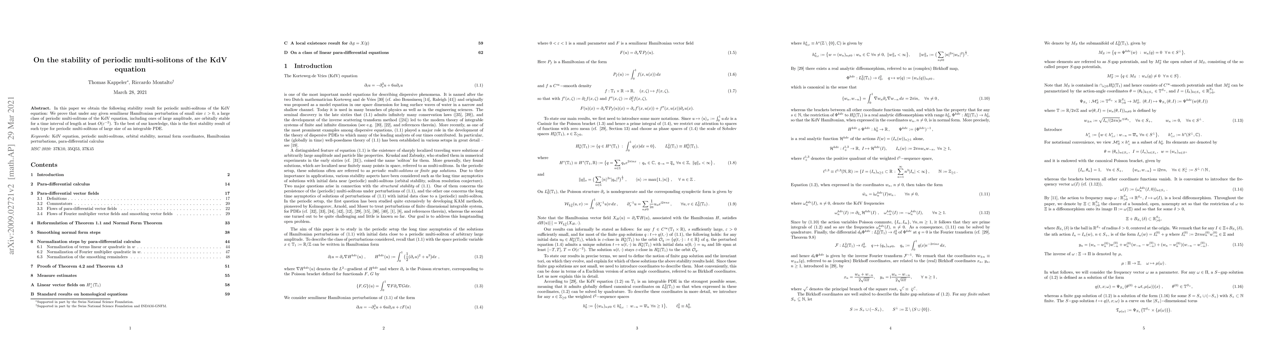 The novelty of this work is in applying Hamiltonian perturbation theory to prove stability for large periodic multi-solitons of the KdV equation, a result not previously established in the literature.