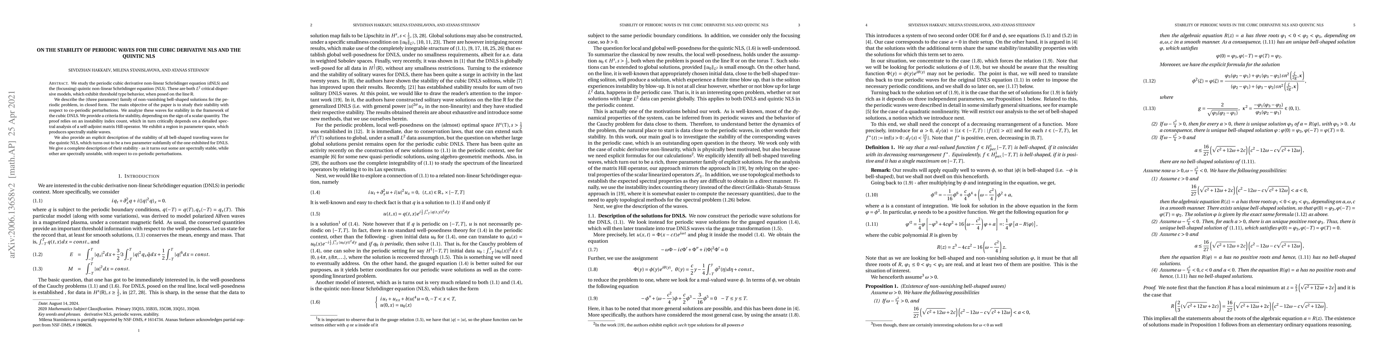 This paper investigates the stability of periodic bell-shaped solutions for the cubic derivative and quintic non-linear Schrödinger equations. It provides a detailed spectral analysis to determine stability criteria, revealing that some solutions are spectrally stable while others are unstable.