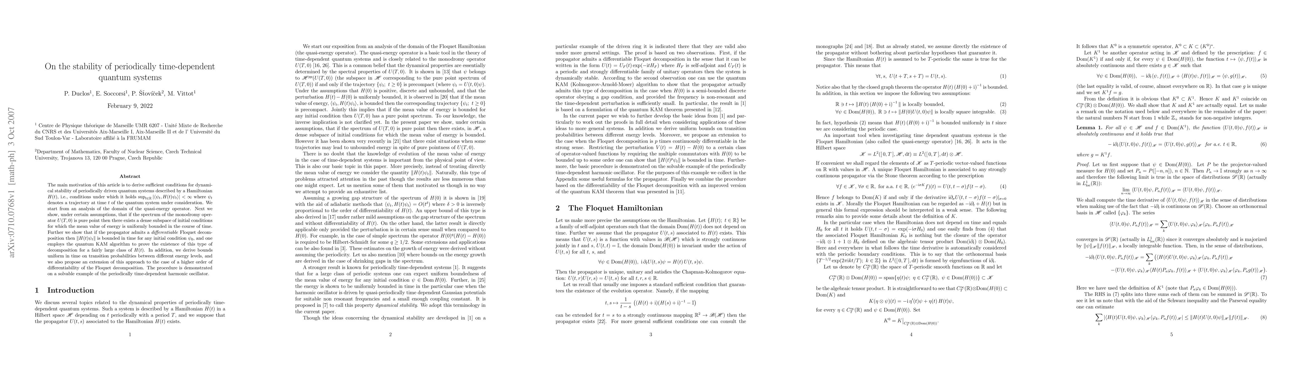 The main motivation of this article is to derive sufficient conditions for dynamical stability of periodically driven quantum systems described by a Hamiltonian H(t), i.e., conditions under which it holds sup_{t in R} | (psi(t),H(t) psi(t)) |<\infty where psi(t) denotes a trajectory at time t of the quantum system under consideration. We start from an analysis of the domain of the quasi-energy operator. Next we show, under certain assumptions, that if the spectrum of the monodromy operator U(T,0) is pure point then there exists a dense subspace of initial conditions for which the mean value of energy is uniformly bounded in the course of time. Further we show that if the propagator admits a differentiable Floquet decomposition then || H(t) psi(t) || is bounded in time for any initial condition psi(0), and one employs the quantum KAM algorithm to prove the existence of this type of decomposition for a fairly large class of H(t). In addition, we derive bounds uniform in time on transition probabilities between different energy levels, and we also propose an extension of this approach to the case of a higher order of differentiability of the Floquet decomposition. The procedure is demonstrated on a solvable example of the periodically time-dependent harmonic oscillator.
