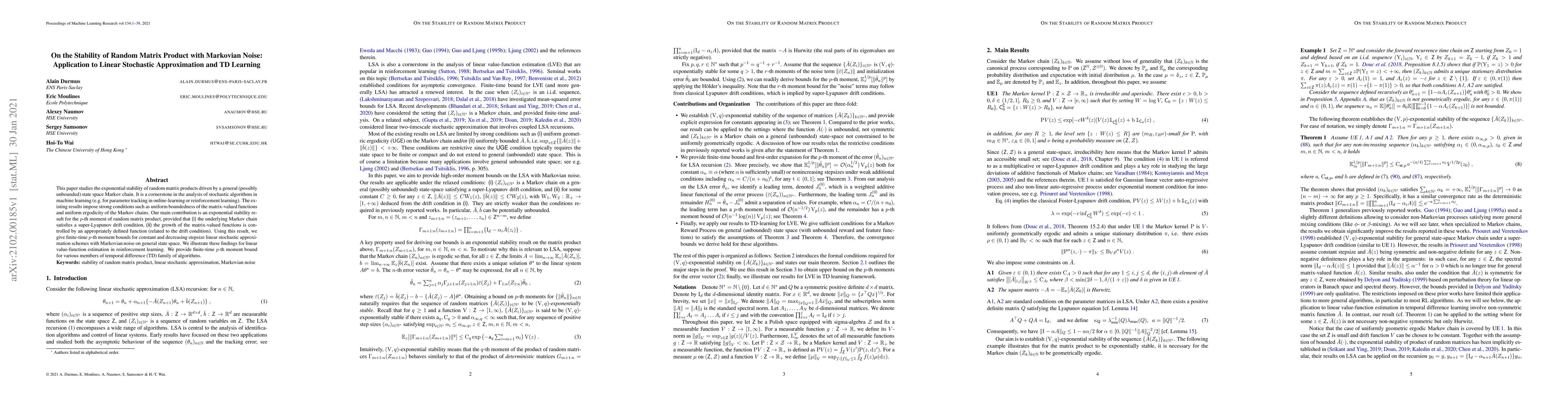 This paper studies the exponential stability of random matrix products driven by a general (possibly unbounded) state space Markov chain. It is a cornerstone in the analysis of stochastic algorithms in machine learning (e.g. for parameter tracking in online learning or reinforcement learning). The existing results impose strong conditions such as uniform boundedness of the matrix-valued functions and uniform ergodicity of the Markov chains. Our main contribution is an exponential stability result for the $p$-th moment of random matrix product, provided that (i) the underlying Markov chain satisfies a super-Lyapunov drift condition, (ii) the growth of the matrix-valued functions is controlled by an appropriately defined function (related to the drift condition). Using this result, we give finite-time $p$-th moment bounds for constant and decreasing stepsize linear stochastic approximation schemes with Markovian noise on general state space. We illustrate these findings for linear value-function estimation in reinforcement learning. We provide finite-time $p$-th moment bound for various members of temporal difference (TD) family of algorithms.