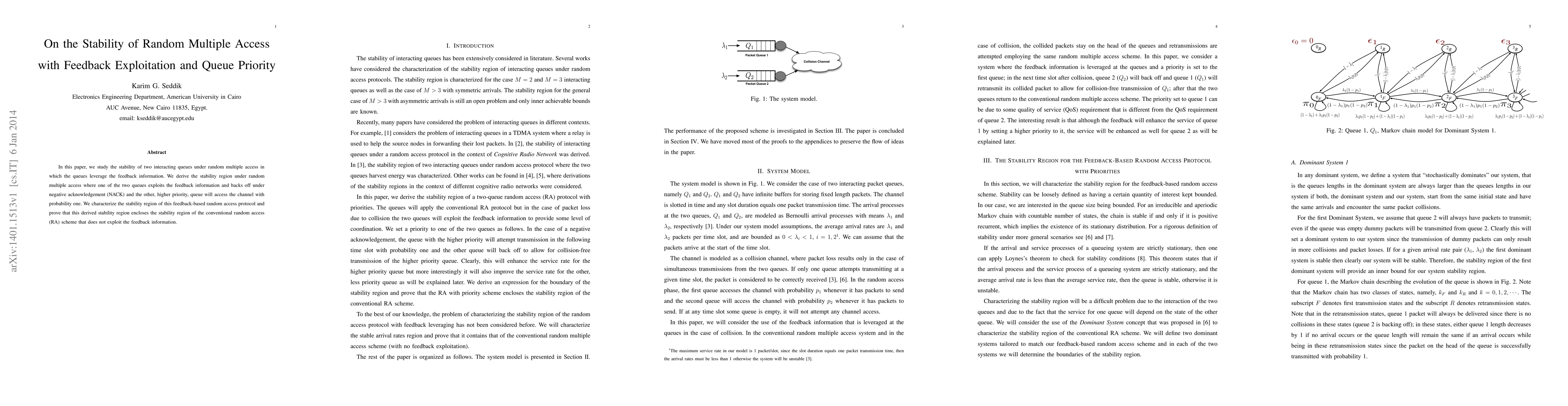 This paper investigates the stability of two interacting queues under random multiple access, where one queue uses feedback information to back off upon negative acknowledgements while the higher priority queue always accesses the channel. The study derives a stability region for this feedback-based protocol and proves it encompasses the stability region of conventional random access schemes without feedback exploitation.