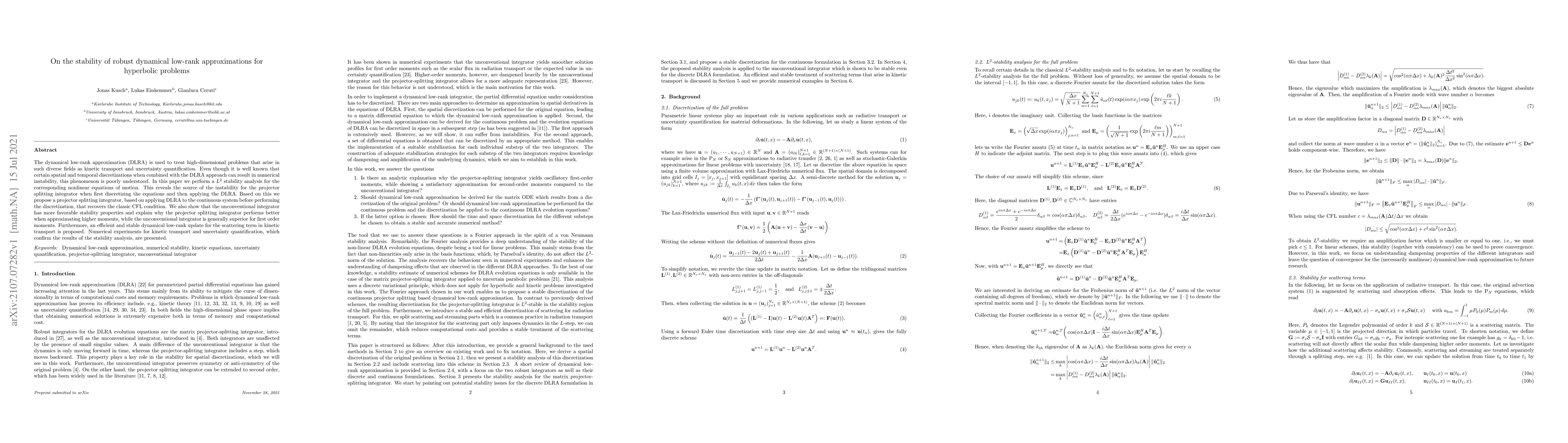 This paper investigates the stability of dynamical low-rank approximations (DLRA) for hyperbolic problems, revealing instability sources in traditional discretization methods. It proposes an unconventional integrator that applies DLRA before discretization, improving stability and performance for higher moments.