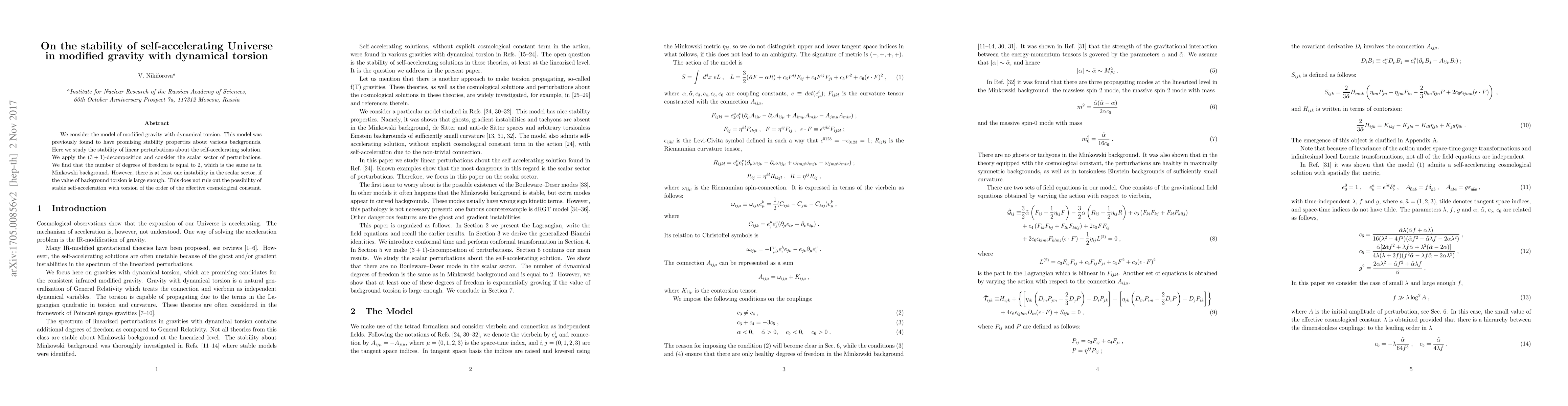 This paper examines the stability of self-accelerating solutions in modified gravity with dynamical torsion, finding two degrees of freedom akin to Minkowski space. However, it identifies an instability in the scalar sector when background torsion is sufficiently large, though stability remains possible for torsion at cosmological constant levels.