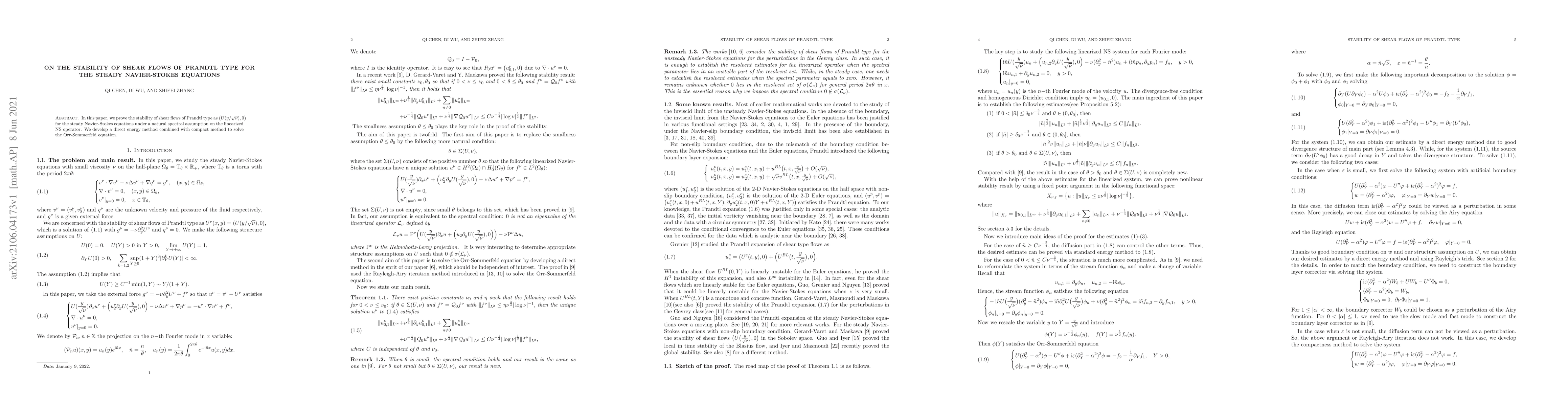 This paper proves the stability of a specific type of shear flow in the Navier-Stokes equations using a direct energy method and a compact solution to the Orr-Sommerfeld equation.