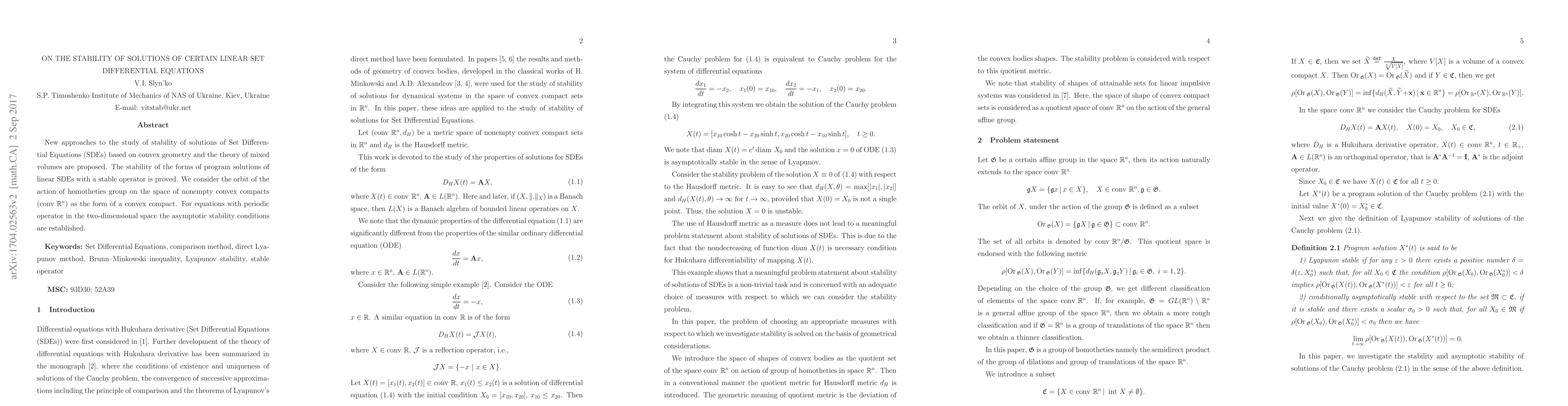 This paper proposes new methods using convex geometry and mixed volumes to study the stability of solutions for certain linear Set Differential Equations (SDEs). It proves the stability of program solutions for linear SDEs with stable operators and establishes asymptotic stability conditions for equations with periodic operators in two-dimensional space.