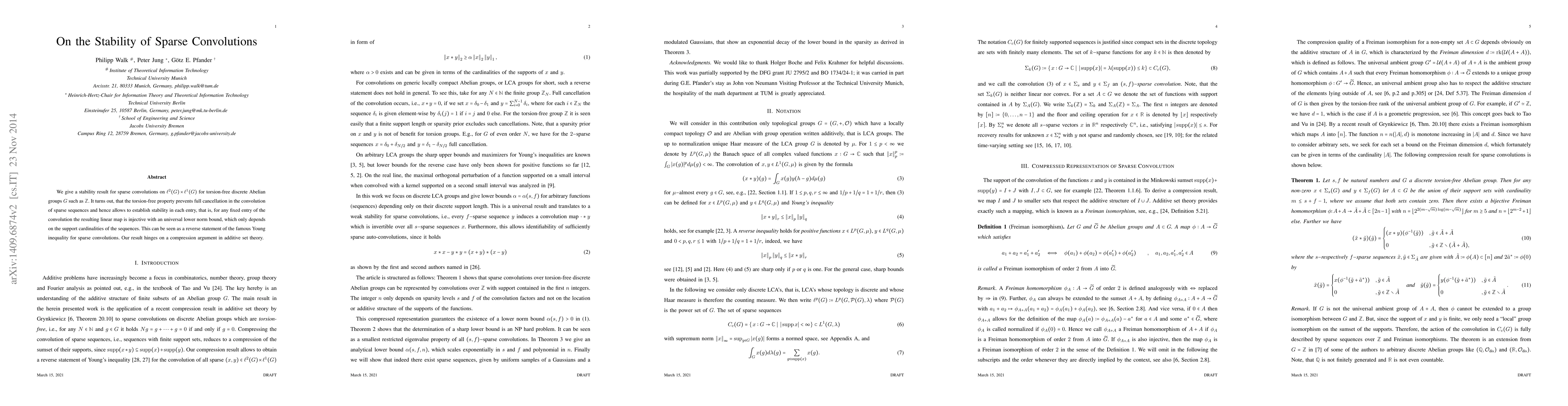 Research paper proves that sparse convolutions on specific groups are stable, meaning their output linear maps are injective with a lower norm bound dependent only on sequence support cardinalities.