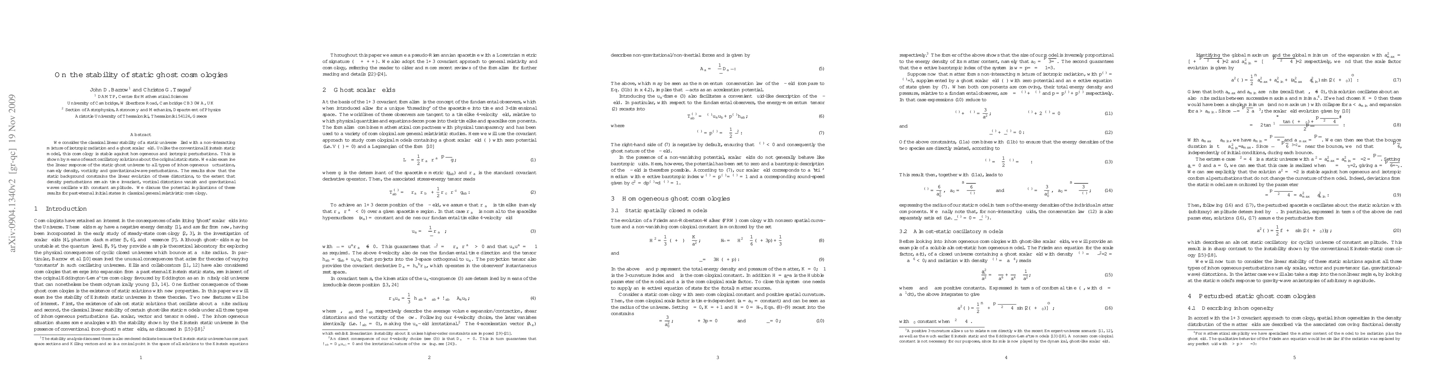 We consider the classical linear stability of a static universe filled with a non-interacting mixture of isotropic radiation and a ghost scalar field. Unlike the conventional Einstein static model, this cosmology is stable against homogeneous and isotropic perturbations. This is shown by means of exact oscillatory solutions about the original static state. We also examine the linear response of the static ghost universe to all types of inhomogeneous fluctuations, namely density, vorticity and gravitational-wave perturbations. The results show that the static background constrains the linear evolution of these distortions, to the extent that density perturbations remain time invariant, vortical distortions vanish and gravitational waves oscillate with constant amplitude. We discuss the potential implications of these results for past-eternal initial states in classical general relativistic cosmology.
